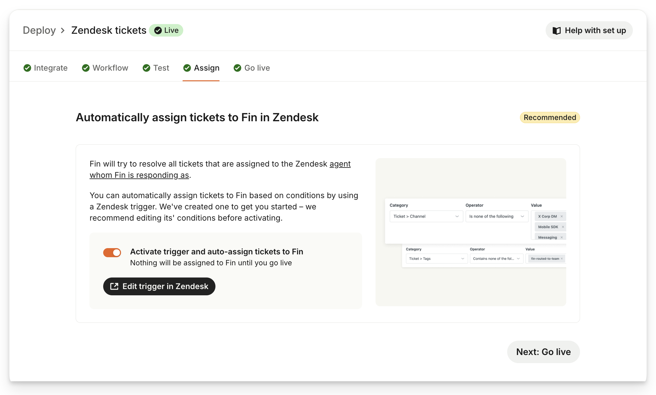 Go to Deploy > Zendesk tickets and select Edit trigger in Zendesk under the "Assign" step.