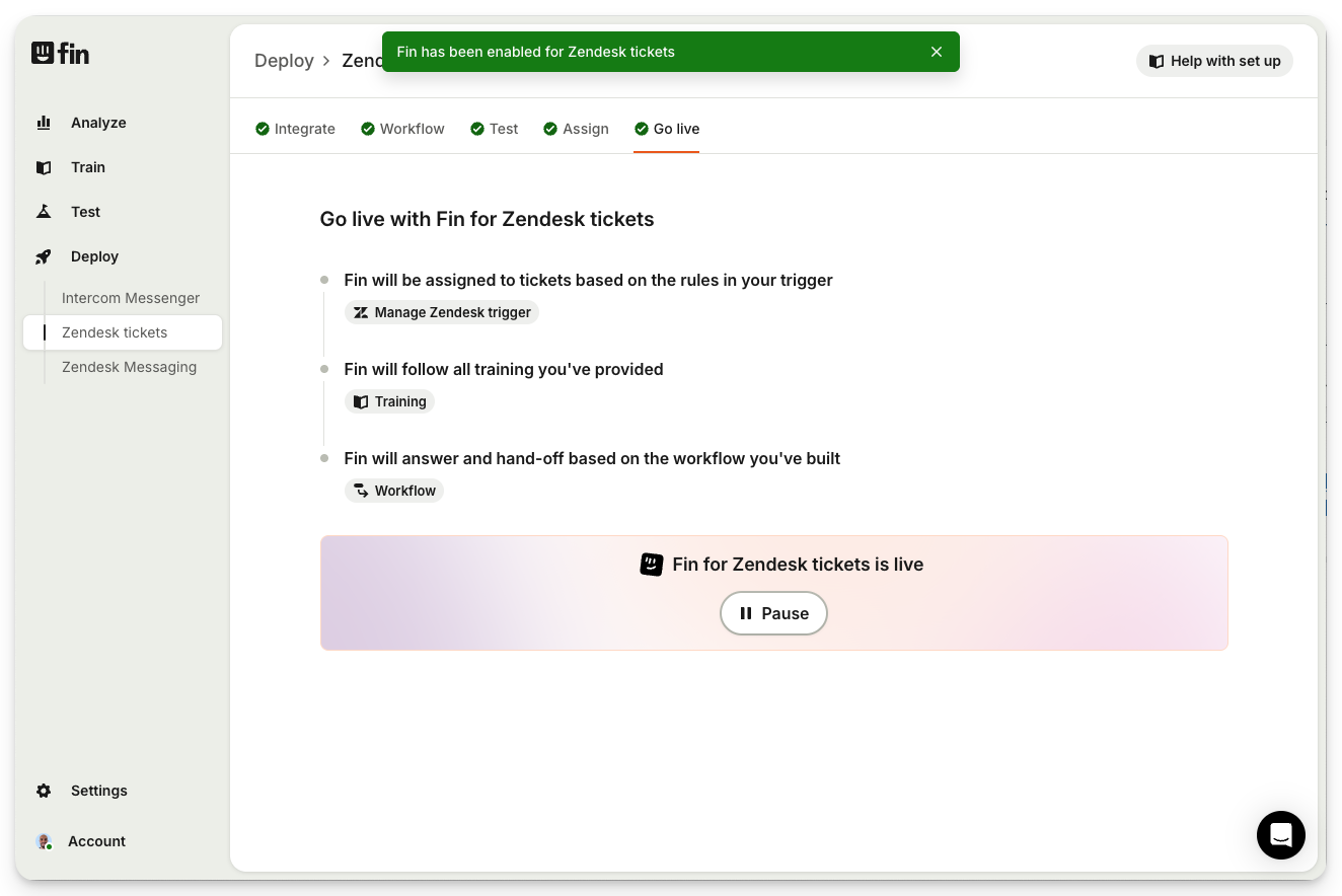 Once you've set Sweo live, you'll see the status update and Sweo will start answering the tickets that you've assigned to it.