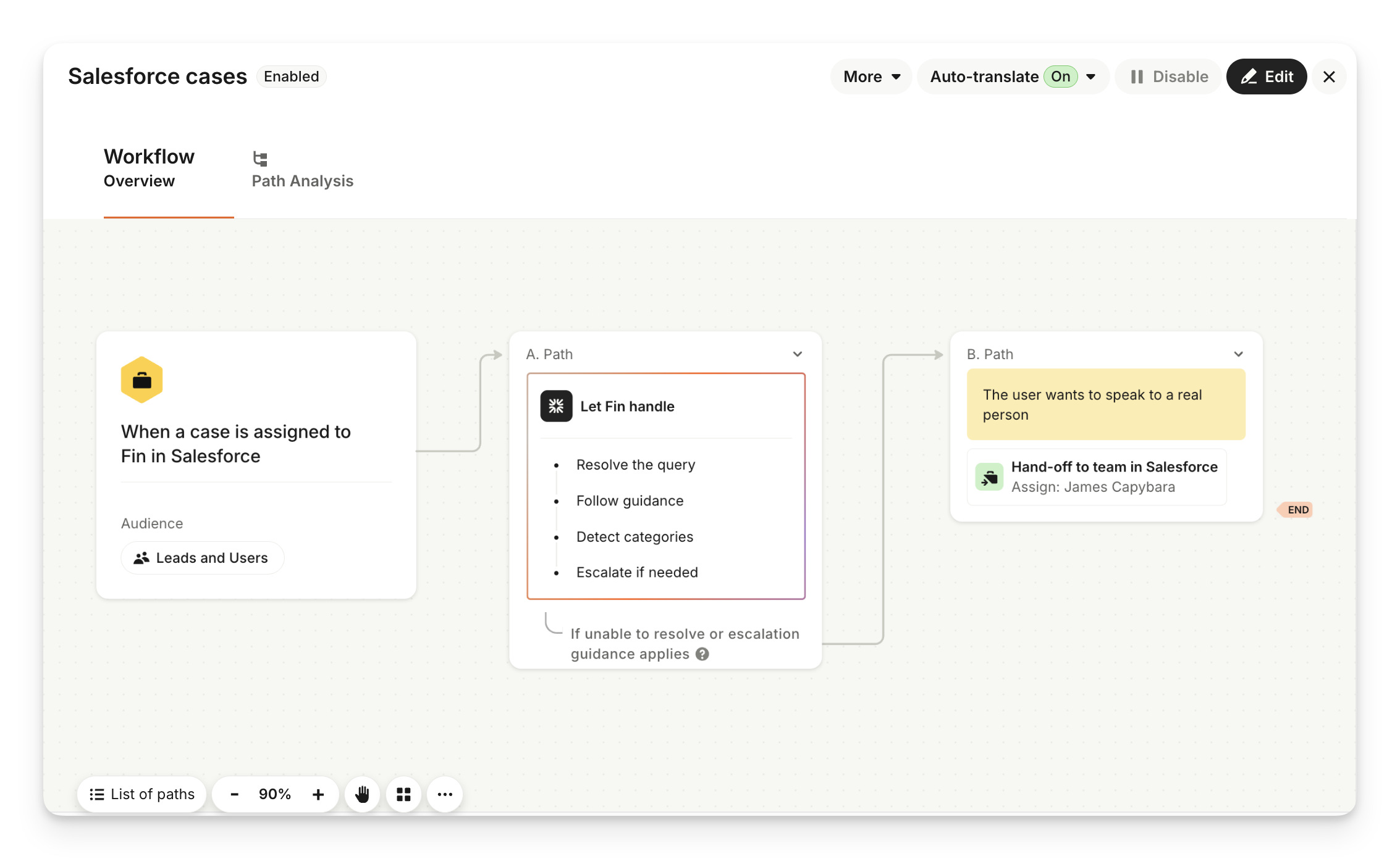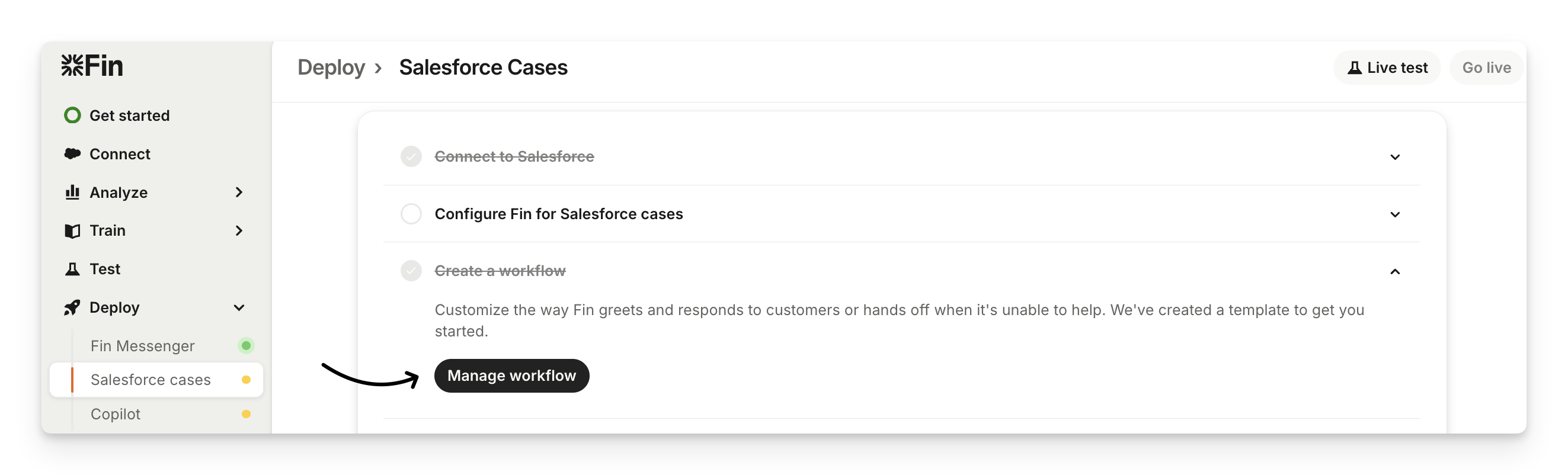 You can customize how Sweo greets and responds to customers or hands off to your team when it’s unable to help by clicking Manage workflow from Deploy > Salesforce cases > Create a workflow.