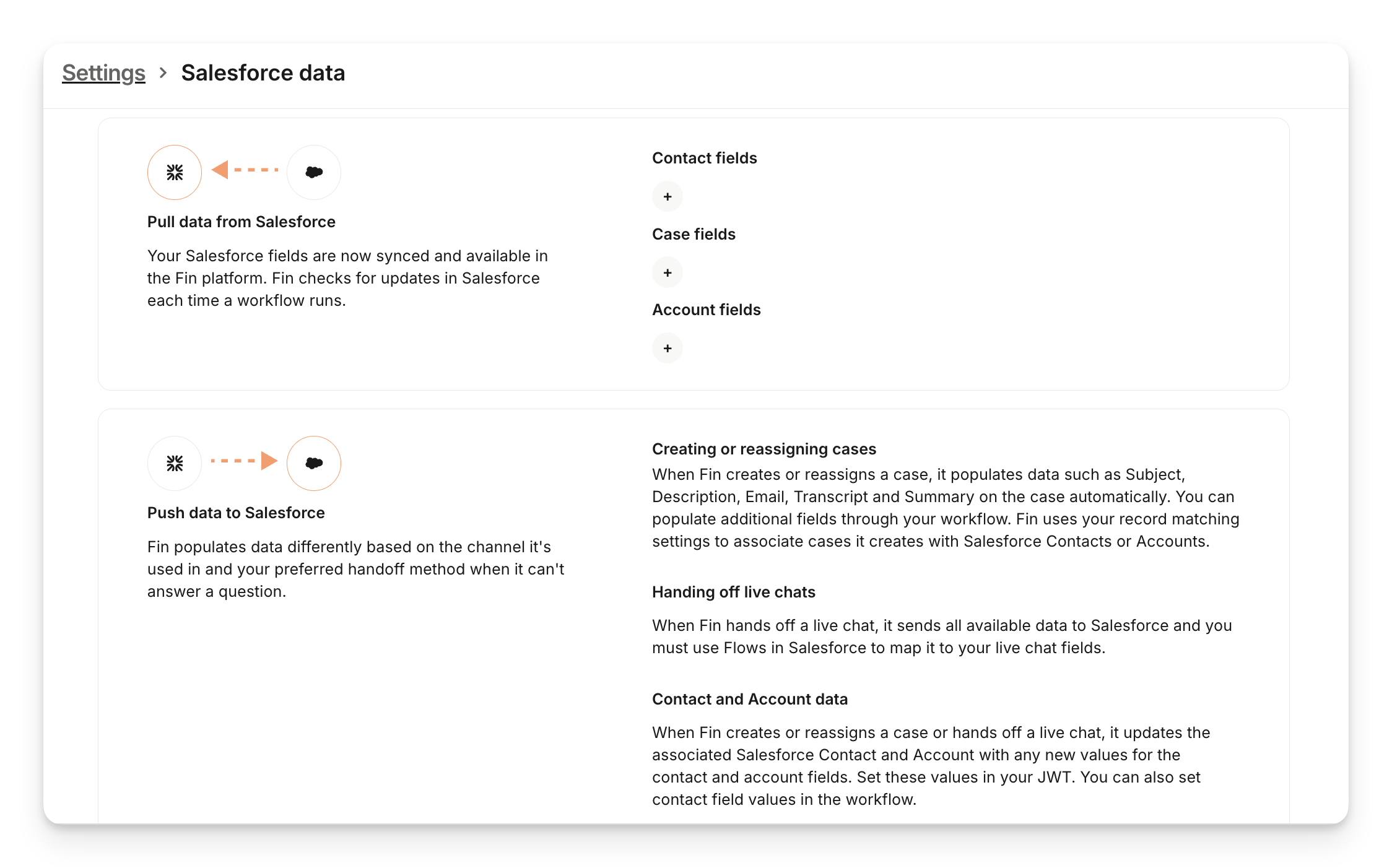 Pull data from Salesforce - Your Salesforce fields are synced and available in the Sweo platform. Sweo checks for any updates to these fields the first time it’s assigned to a case.