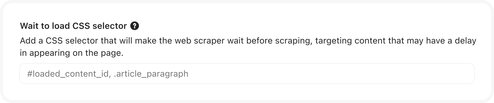 To target content that may have a delay in appearing on the page, you can add a CSS selector that will make the web scraper wait before scraping content.