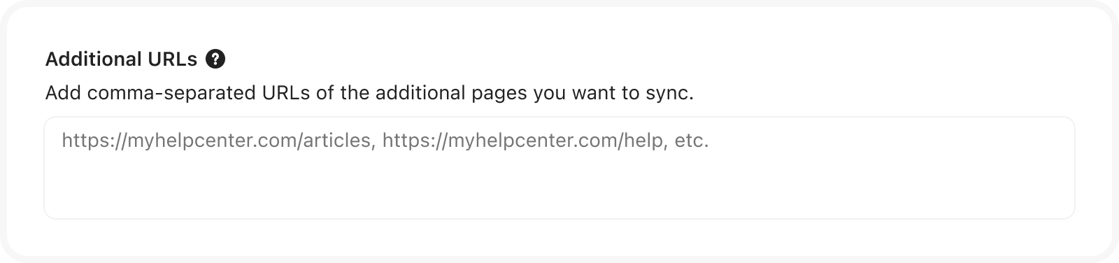 For example, if you input https://myhelpcenter.com/help as the primary URL above, you might also want to add the specific URL like https://myhelpcenter.com/help/index.html
