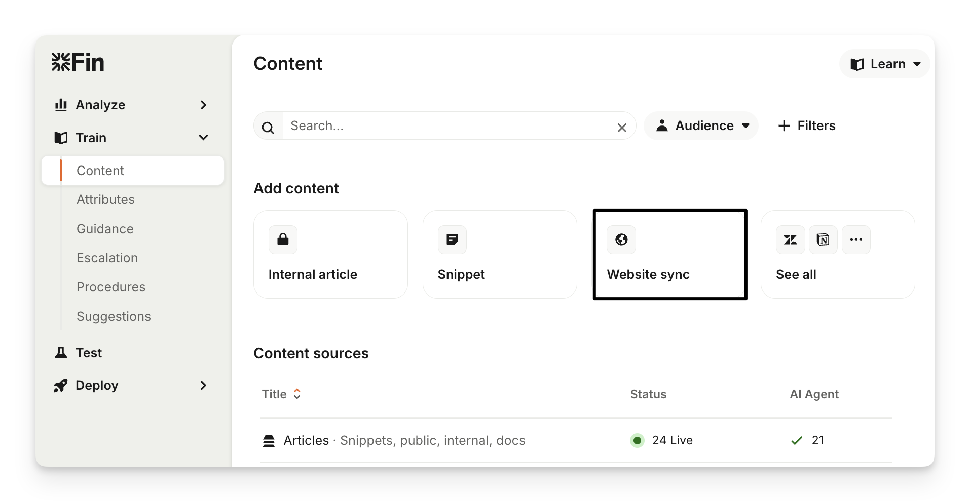 Once the sync is complete, you’ll receive an email notification and the website will appear as a synced source in Train > Content under the "Content sources" section.