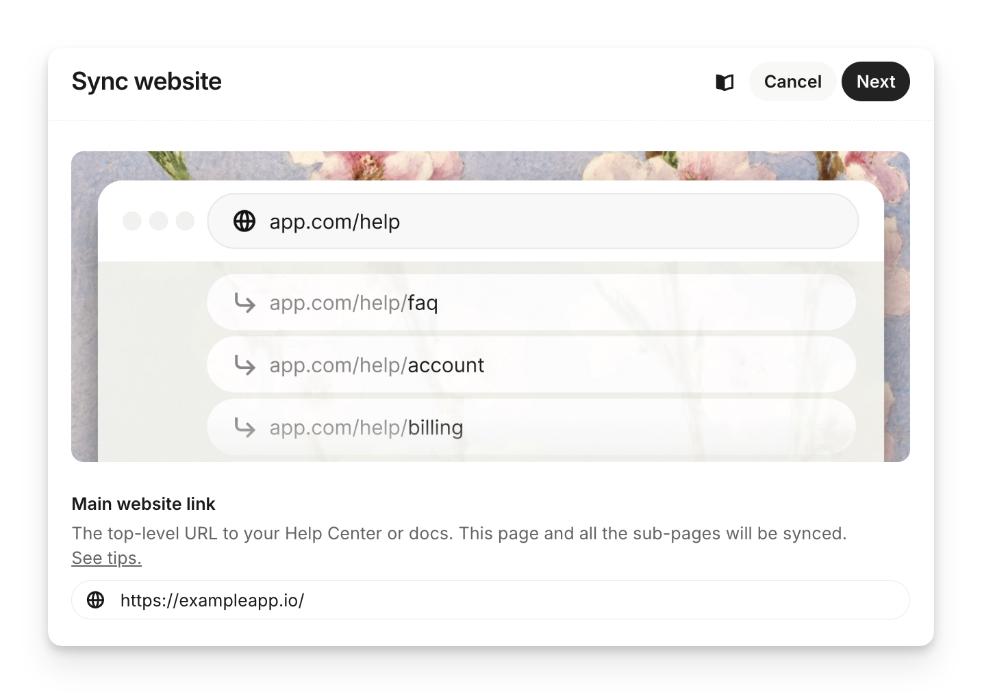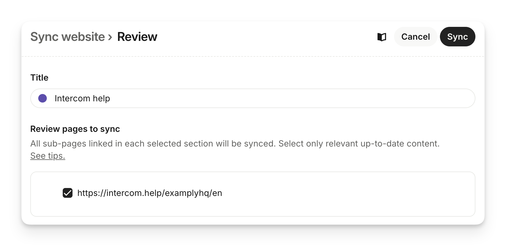 Once you input your URL, we will check that it's valid and accessible. Then you'll need to review the pages to sync. All sub-pages linked in each selected section will be synced. Select only relevant up-to-date content.