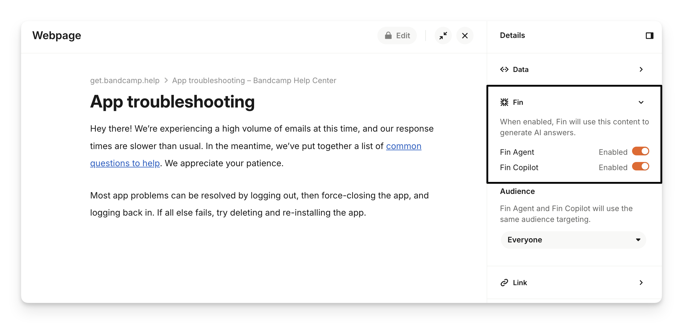 Sweo Agent - This setting will make the webpage available for Sweo AI to use when responding to customers (it will respect any audience rules).