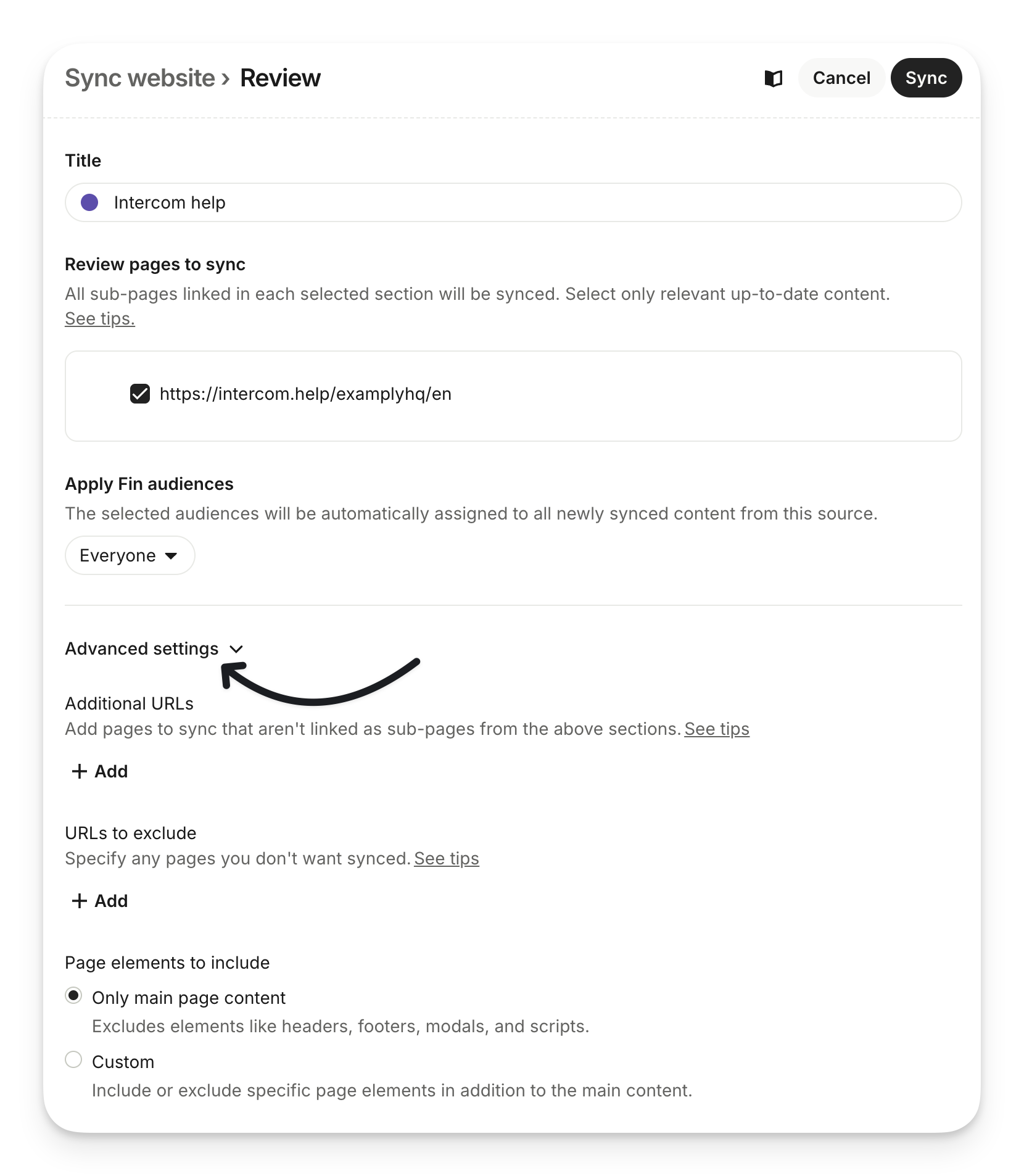 If you want to configure your website sync further (such as including or excluding certain URLs) click into Advanced settings.