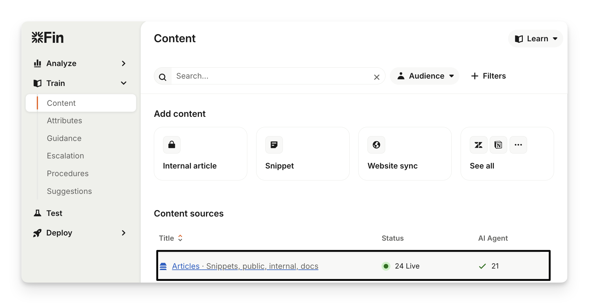 Then go to Train > Content and click on Articles (Snippets, public articles, internal, docs) under the "Content sources" section, then open the snippet.