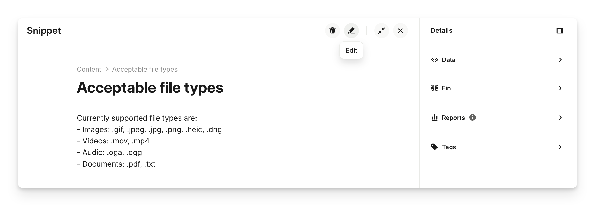 To edit an existing snippet, go to Train > Content and click on Articles (Snippets, public articles, internal, docs) under the "Content sources" section, then open the snippet and click the Edit icon.