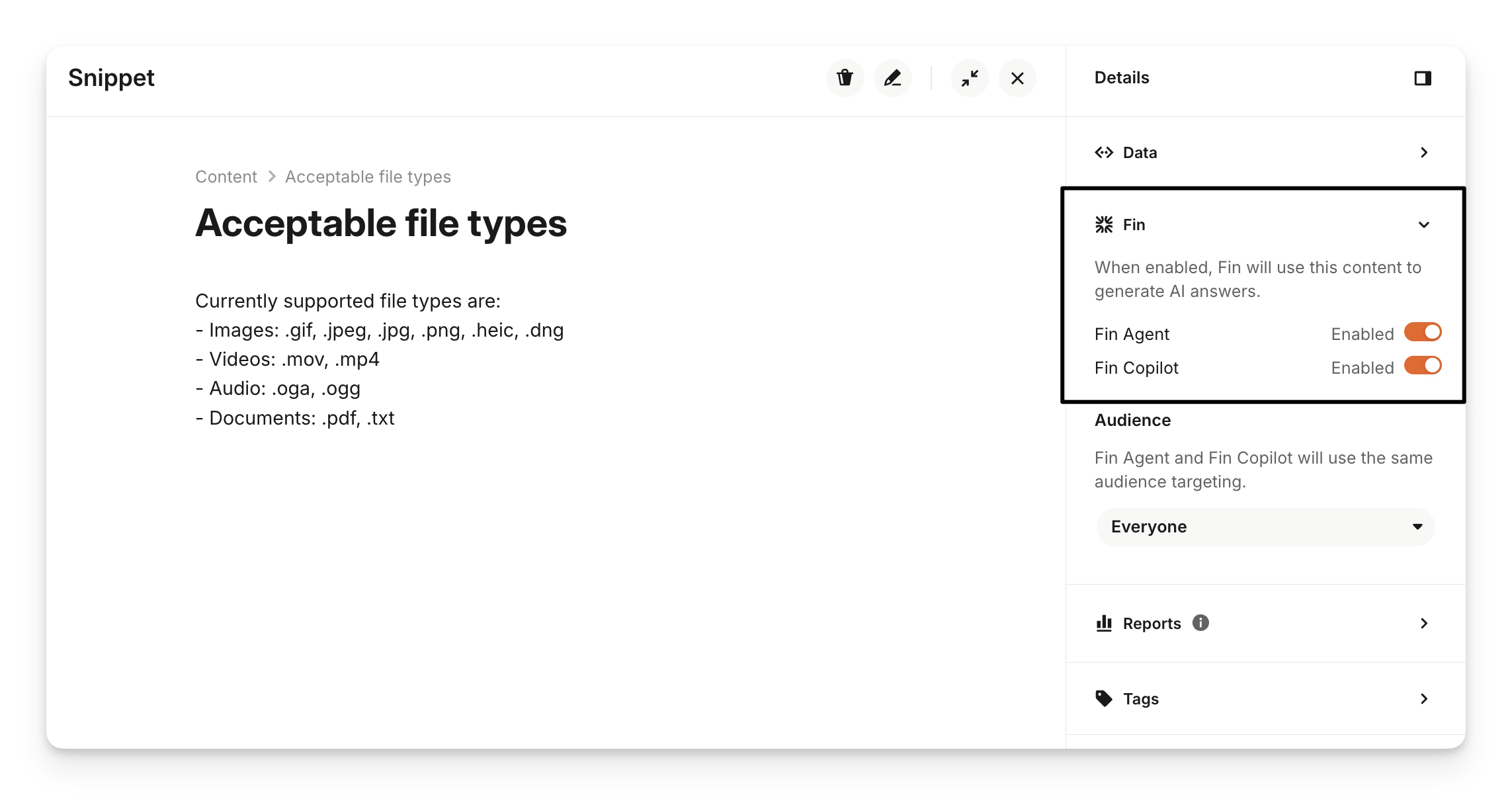 Sweo Agent - This setting will make the snippet available for Sweo Agent to use when responding to customers (it will respect any audience rules).