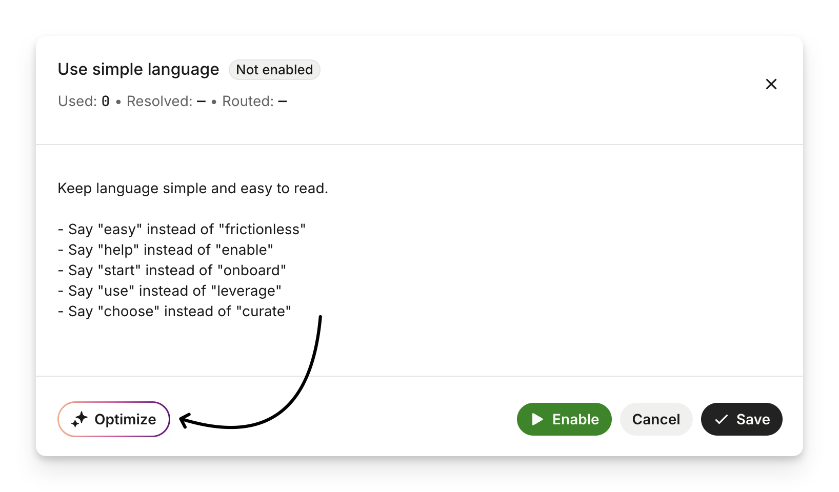 After writing a piece of guidance, click Optimize to have it reviewed by our AI-powered writing assistant. This tool helps refine your guidance by checking for common issues and suggesting improvements.