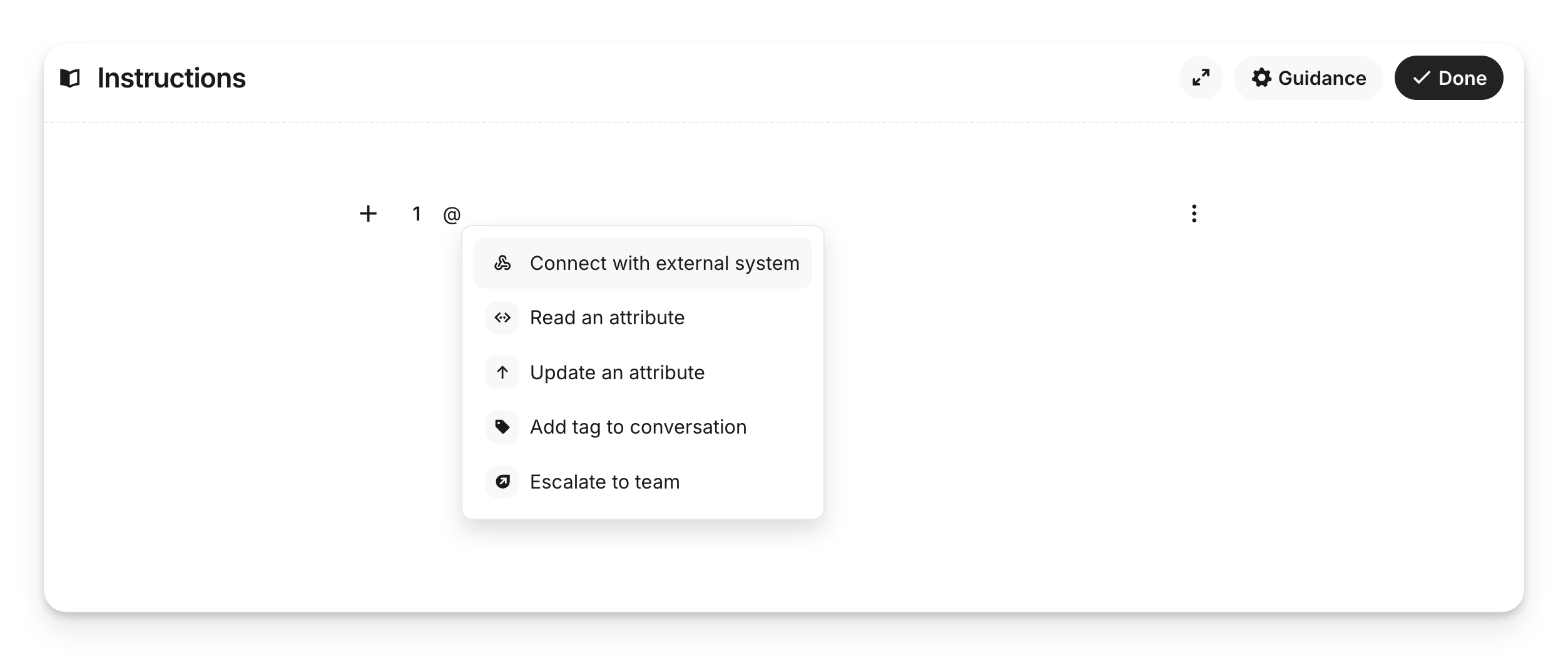 Add attributes to the instructions block by typing "@" in line with your text instructions. This allows Sweo to read and update attributes based on your specific business rules, at clear moments, with precise values. You can use any people, company, conversation, or temporary attribute.