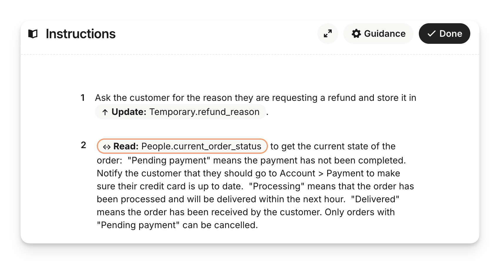 Tip: The Instructions editor can be expanded using the toggle in the top right.