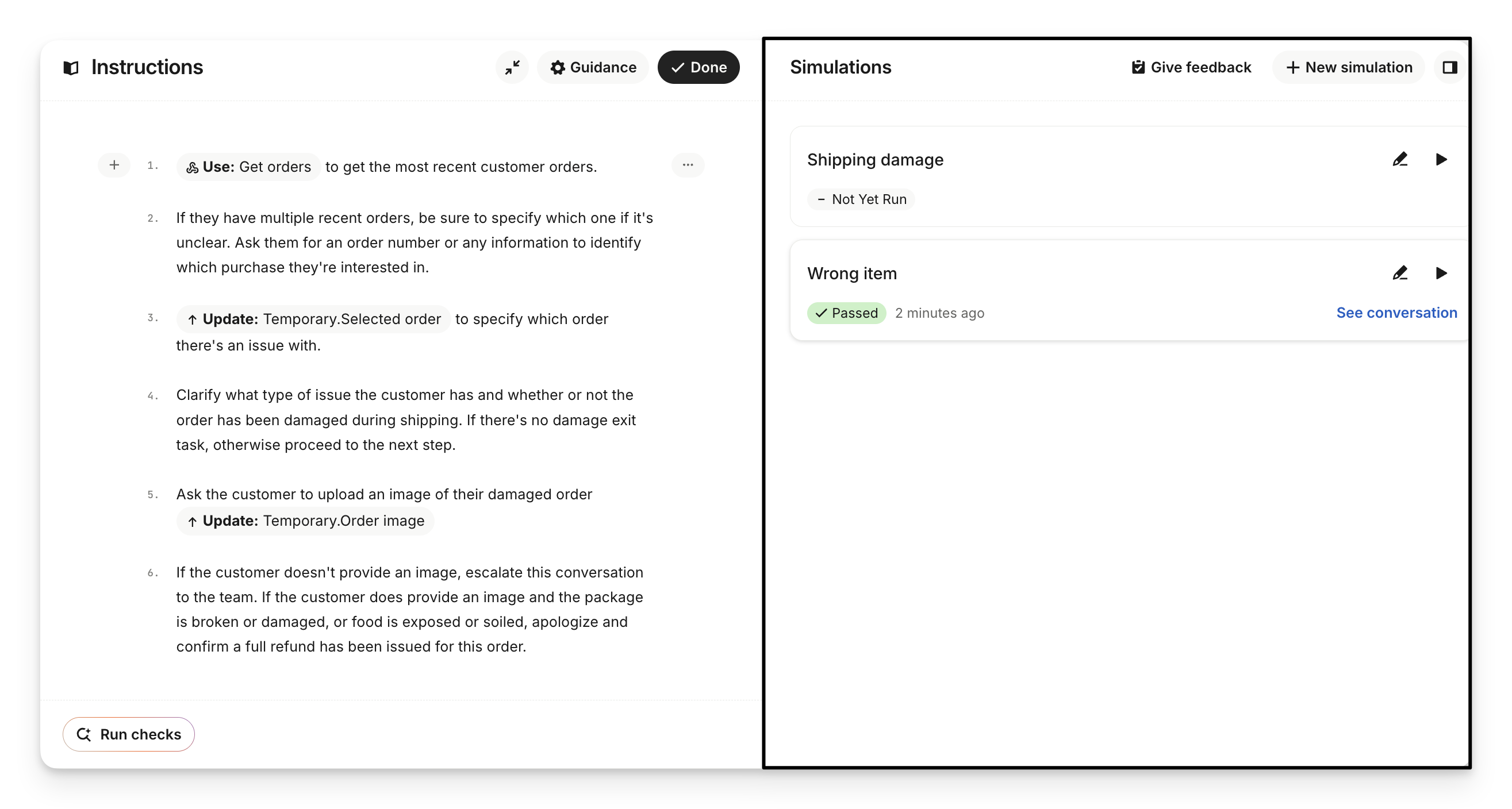 For any simulation you’ve run, you can click See conversations to view the back-and-forth between the simulated customer (based on the context you provided) and Sweo. This transcript helps you understand how logic flowed and why a test passed or failed.