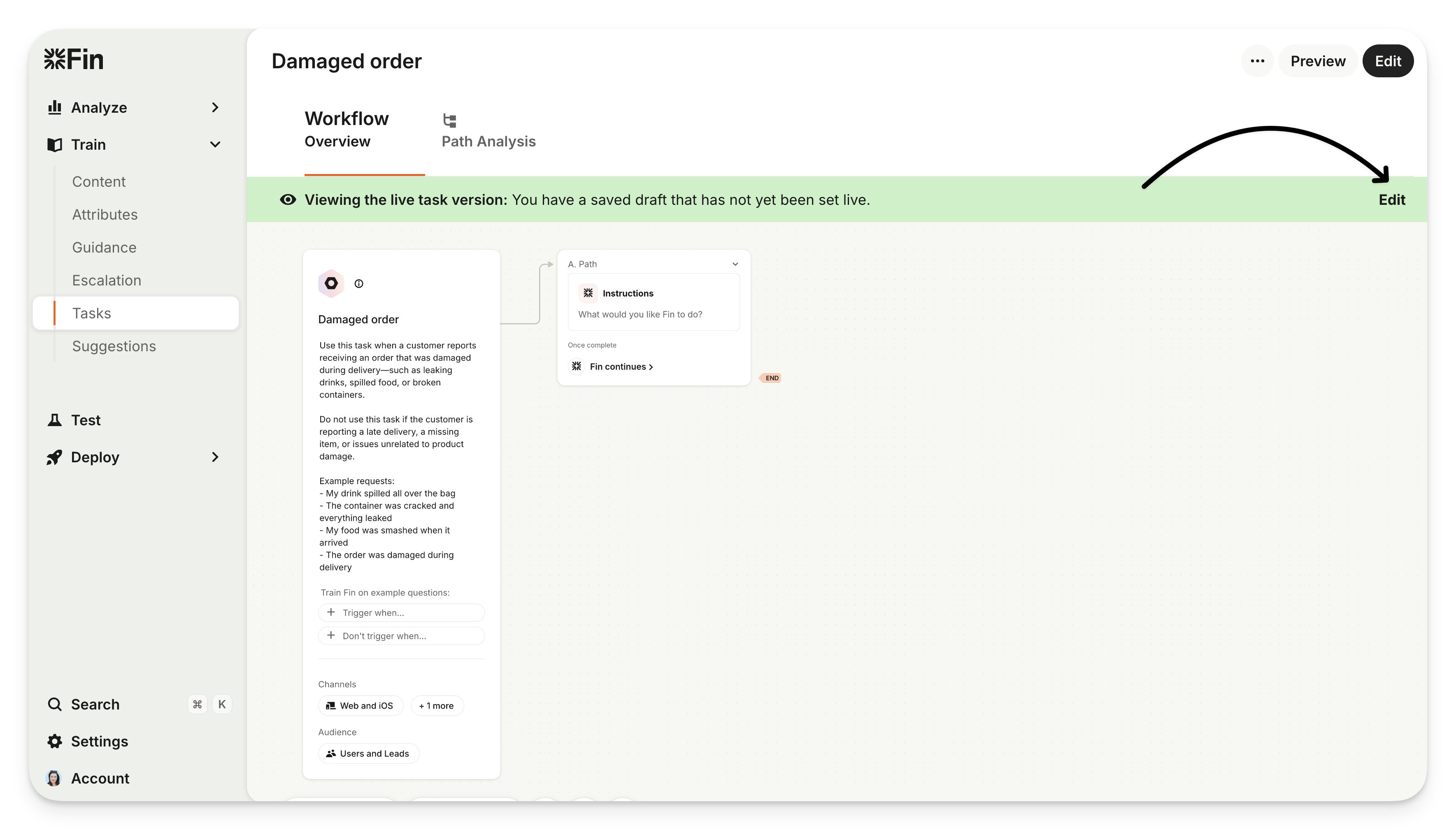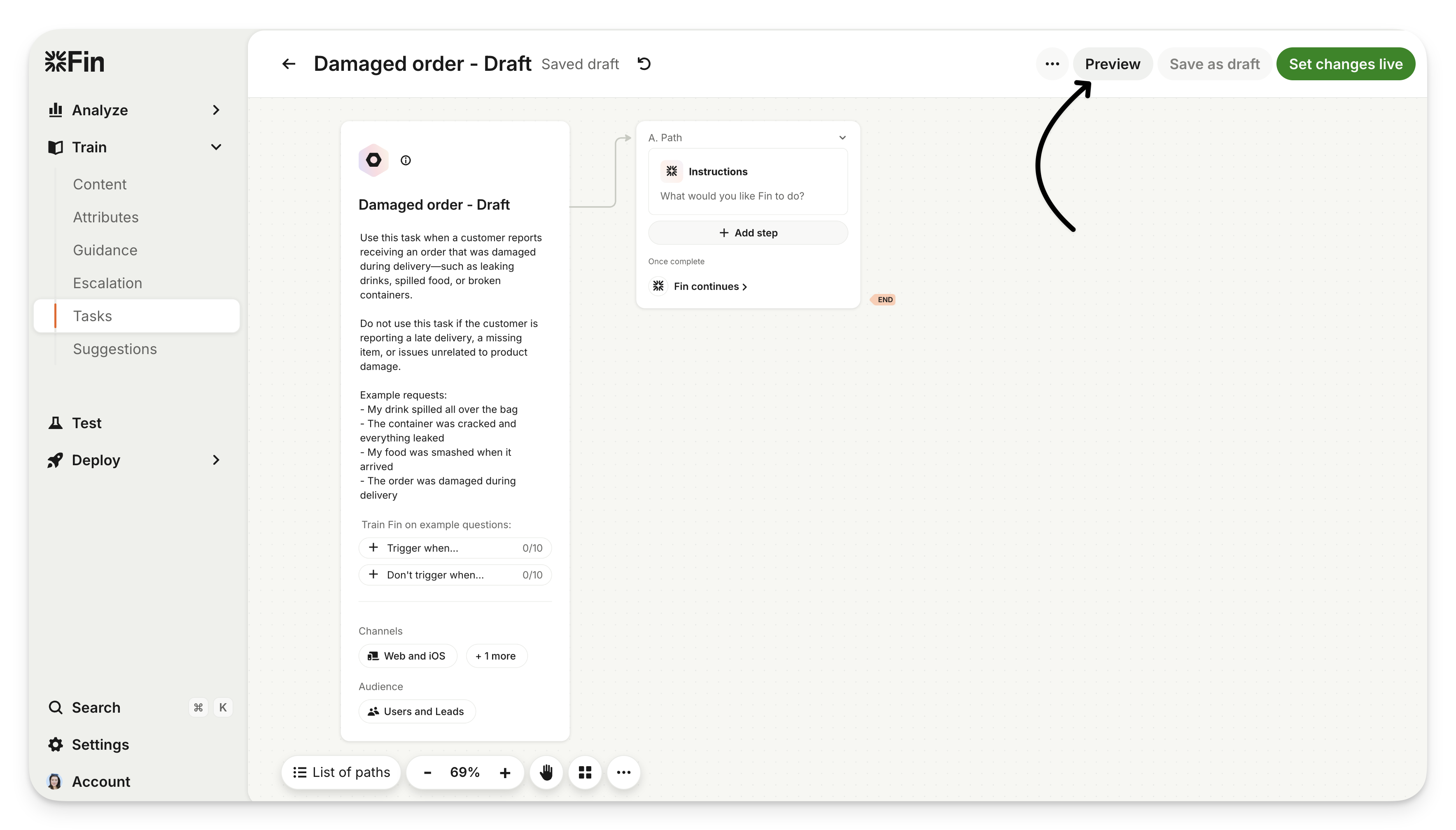 Test with Preview: Open Preview from the editor to have a test conversation with your draft version. This is the quickest way to see how your new changes feel.