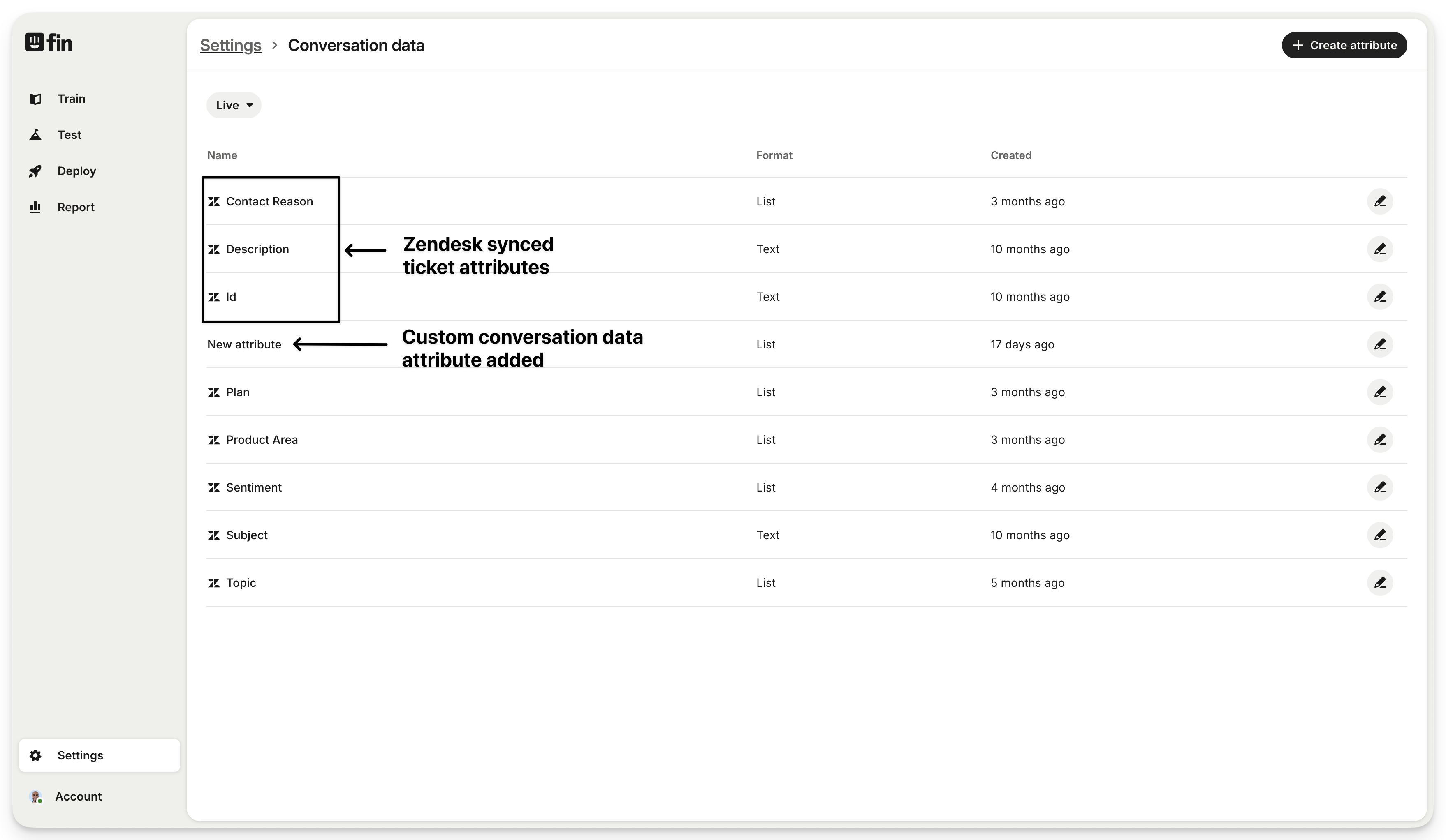 Its possible to create new conversation data attributes within the Sweo platform – simply hit "Create attribute" in the top right.