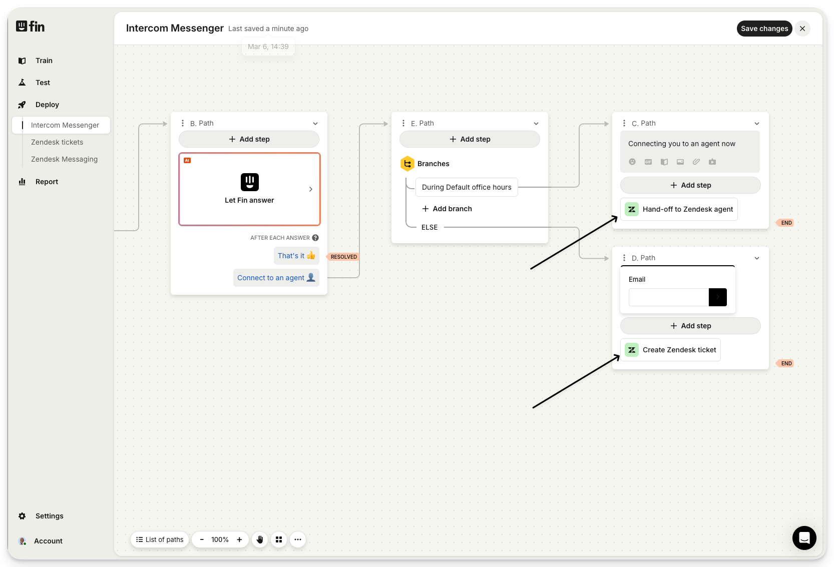 Once you're editing your workflow, you can add either the "Hand off to Zendesk agent" step, or the "Create Zendesk ticket" step, depending on which option makes most sense. In the example below, we're using both optons depending on wether its during office hours.