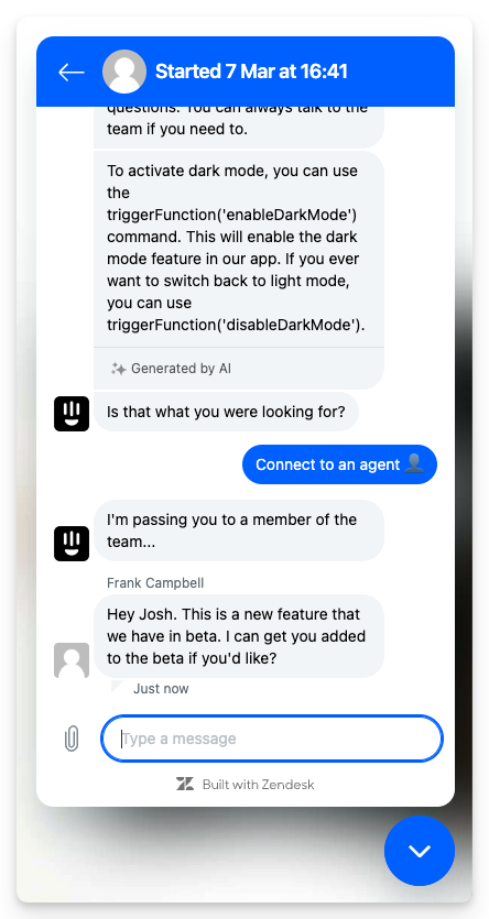 Your team's experience This creates a conversation in Zendesk for one of your agents to pick up and continue chatting to the end-user. |