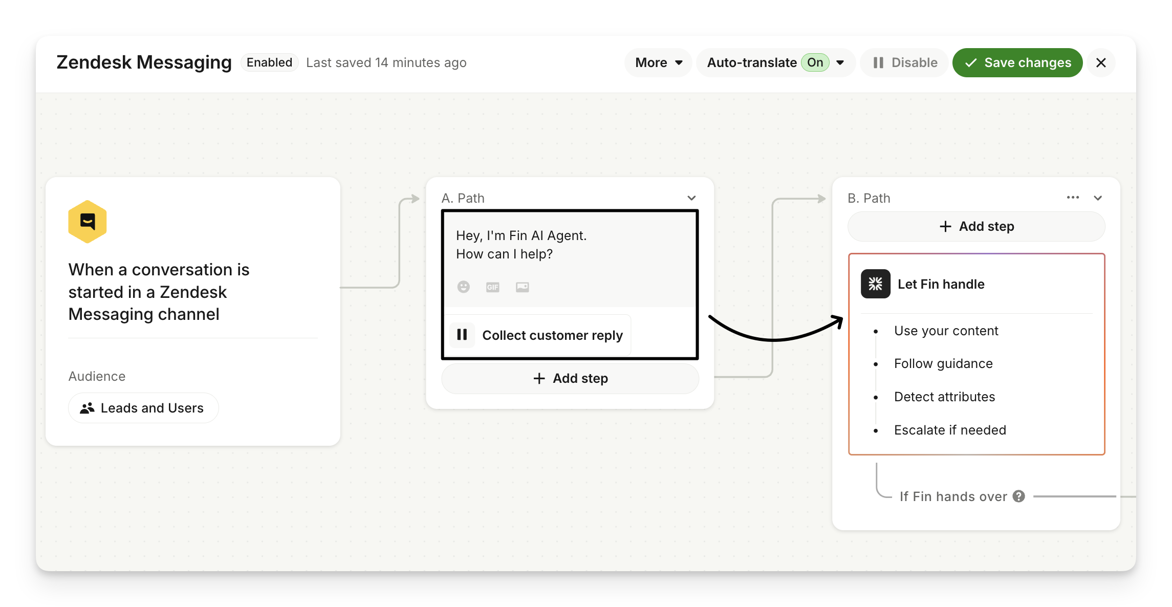 Add the "Hand-off to Zendesk agent" step.
