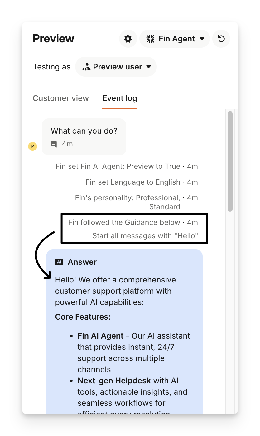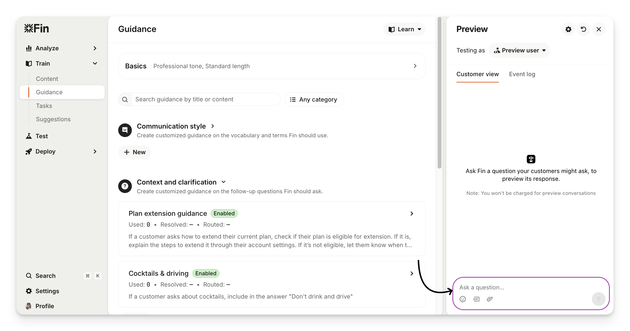 Note: All guidance types—draft, paused, and live—are included in preview testing. You don’t need to save or enable guidance to test it.