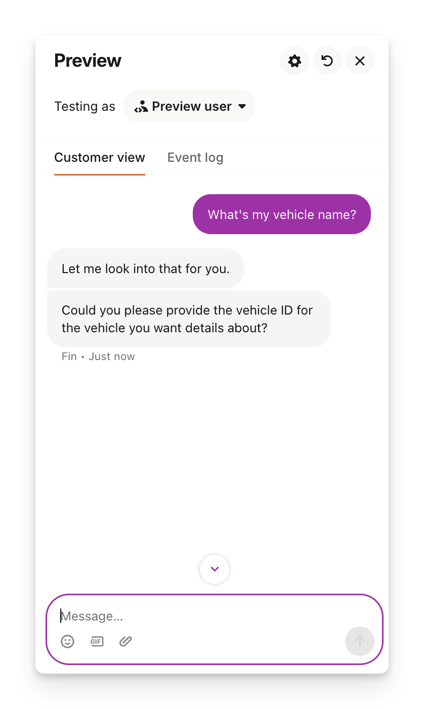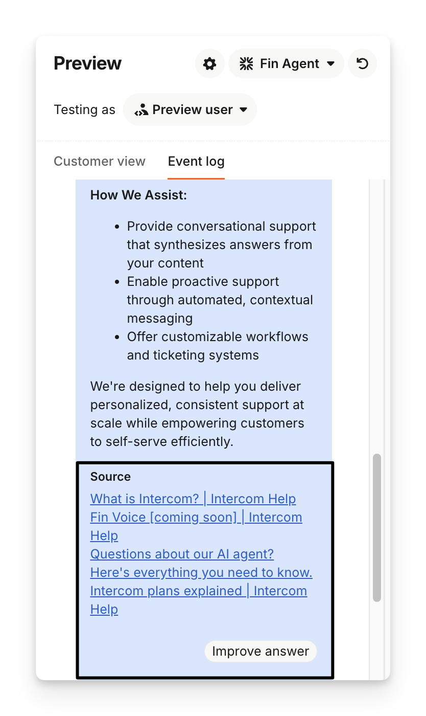 When Sweo answers in your preview, you can see both the customer view and the event log. The event log shows you the events that are happening behind the scenes, and also the sources that Sweo used to create its answer.