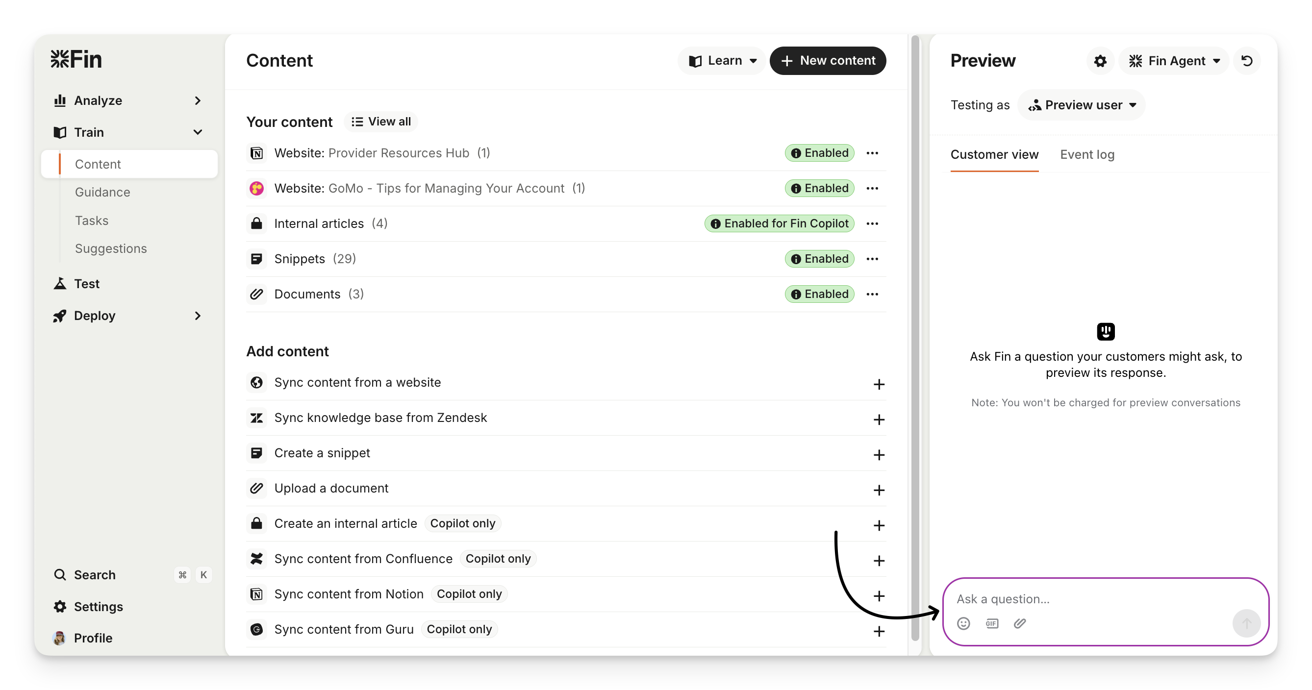 When you're in the Train > Content area, you can use the Preview panel to ask Sweo questions and confirm it’s pulling answers from the right sources. This helps you validate that Sweo’s responses match your content or connected data.