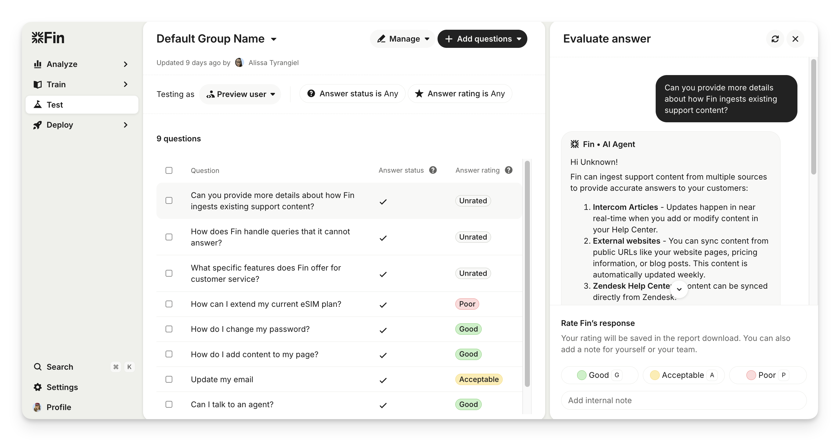 The Test section is for comprehensive batch testing. It helps you check content coverage, debug unexpected results, check Sweo's behavior, and rate Sweo’s responses for multiple questions at a time.