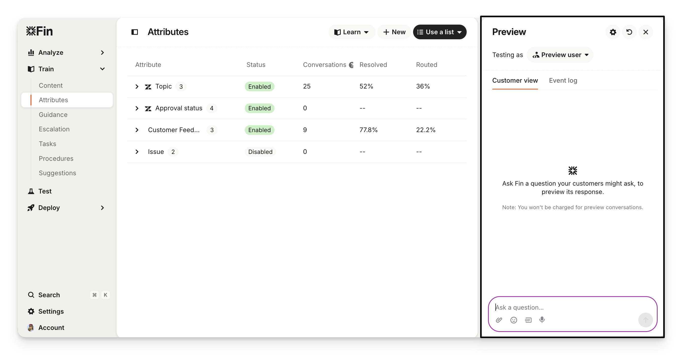 In Train > Attributes, use the Preview panel to:
