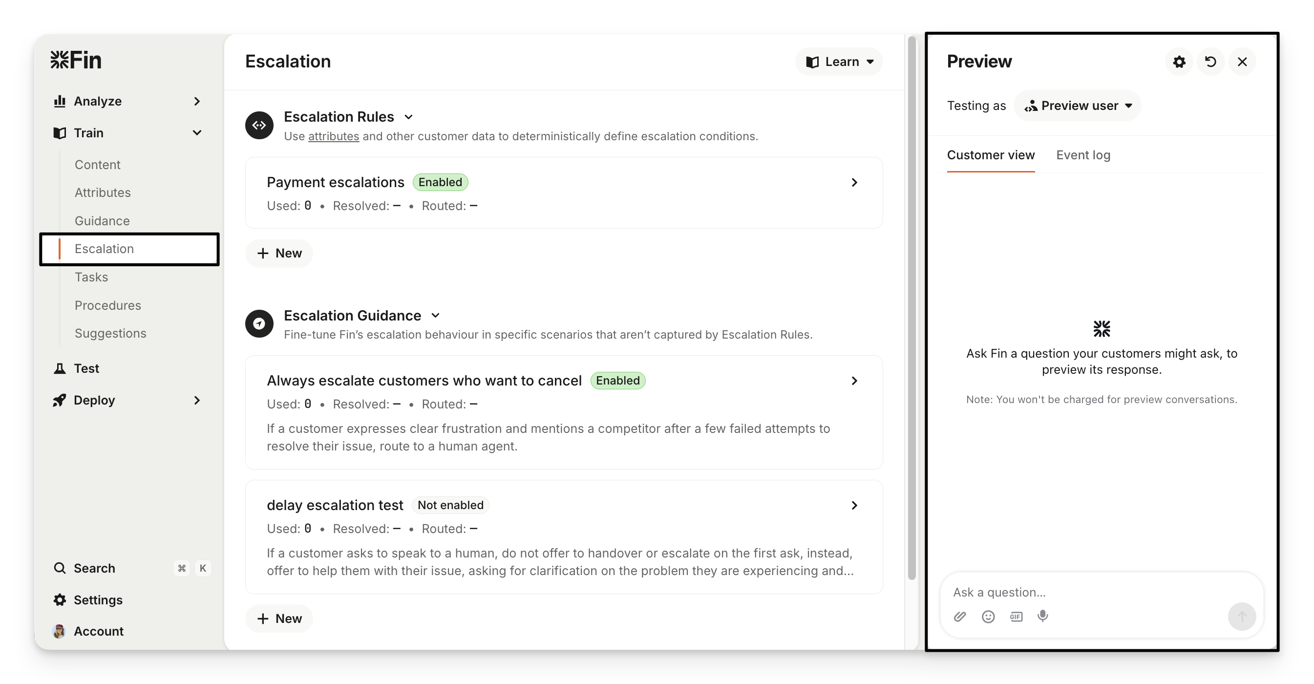 In Train > Escalation you can preview both Sweo’s Escalation Rules and Escalation Guidance safely before they affect real customers.
