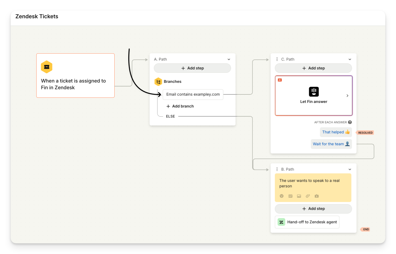 email containsbranch you can add a test of "Let Sweo answer" - this will enable you and your teammates to send some test questions for Sweo to answer without Sweo being triggered by your customers.You can also personalize the handover experience from Sweo to a teammate.