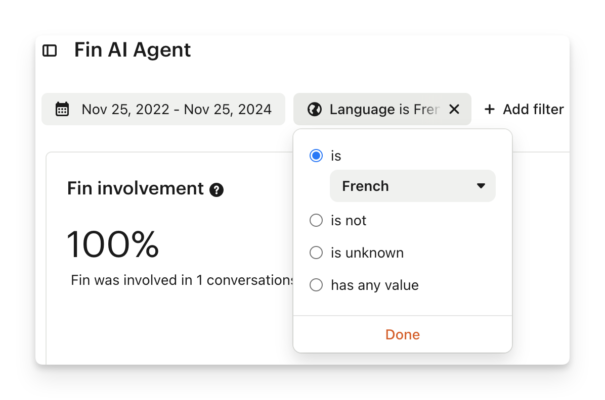 You can filter the report by language. Click on Add filter > Language, and then select the languages you would like to filter the report by.