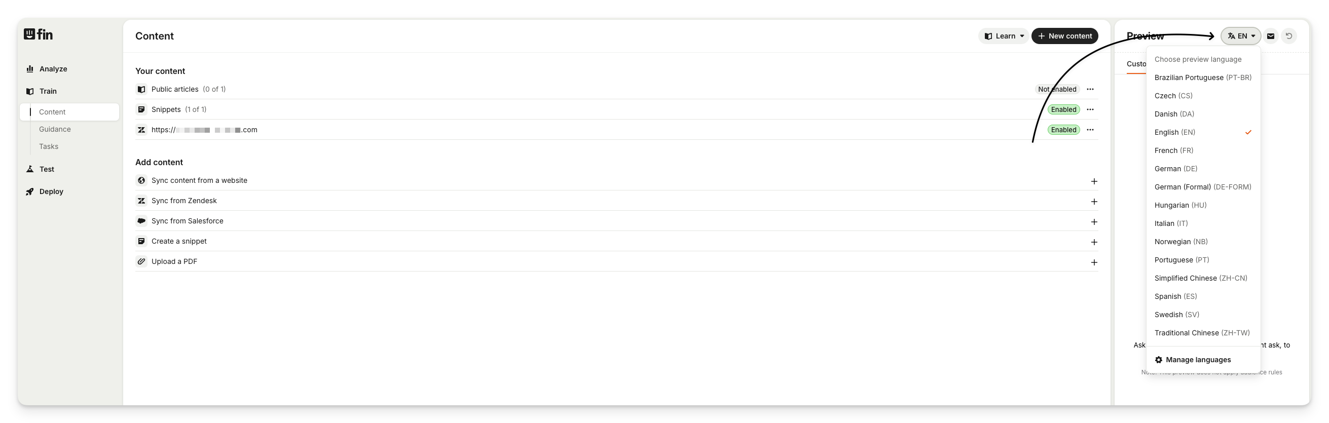 Before setting Sweo AI Agent live, you can test it by using the Messenger preview from Train > Content. There is a language option above the preview to select the language you want to test.