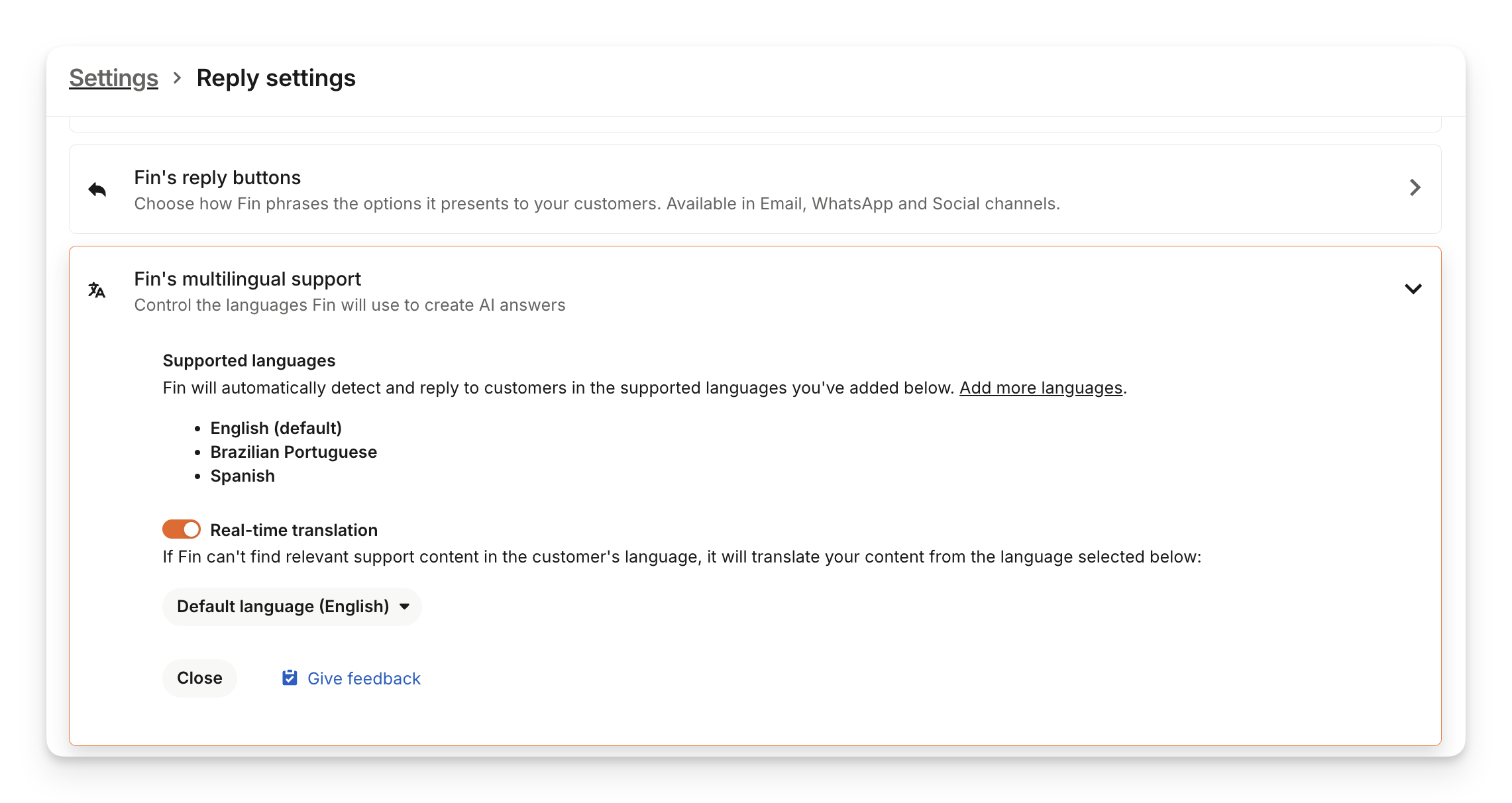 Go to Settings > Reply Settings and under the Sweo's multilingual support dropdown, enable "Real-time translation". Then in the Default language dropdown menu, select the language of the content you want Sweo to translate into other languages, and save your changes. The Default language option is your workspace's default language.