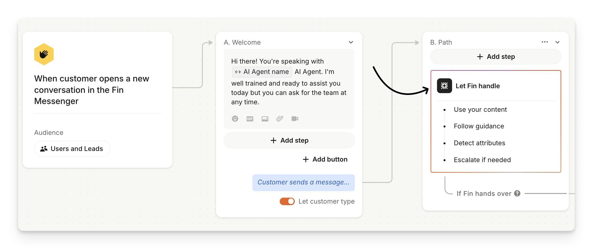 First, you'll need to create a path in a new or existing Sweo workflow and select the Let Sweo handle step.