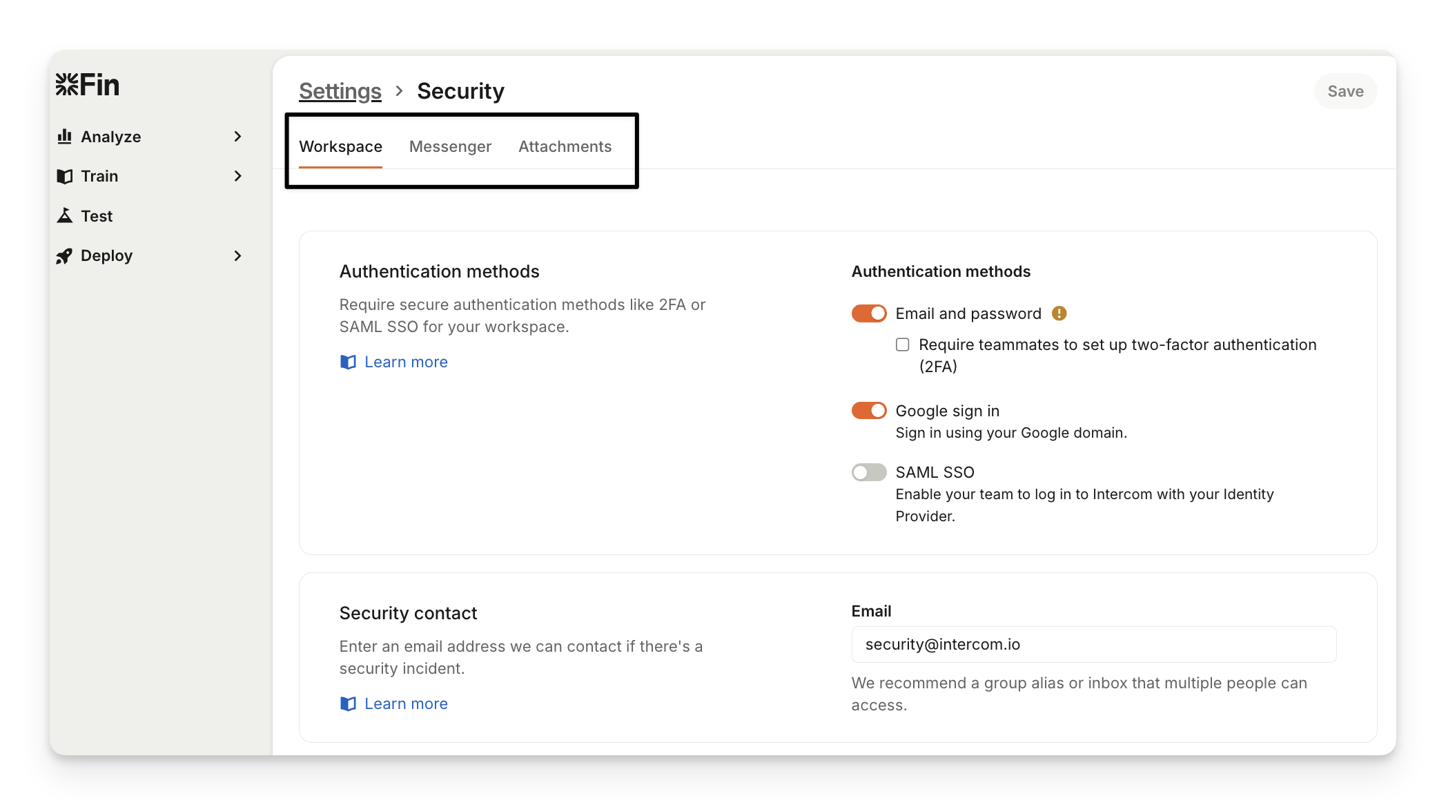 In the Workspace tab you can configure your identity provider and require secure authentication methods, specify a security contact for your workspace, prevent unauthorized access by restricting which IP addresses can access your workspace as well as set a custom session to force teammates to re-authenticate after a set period of time.