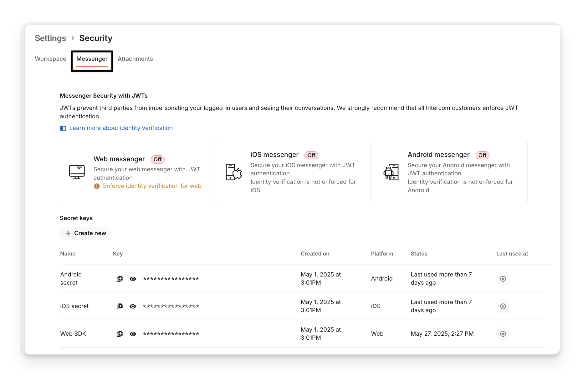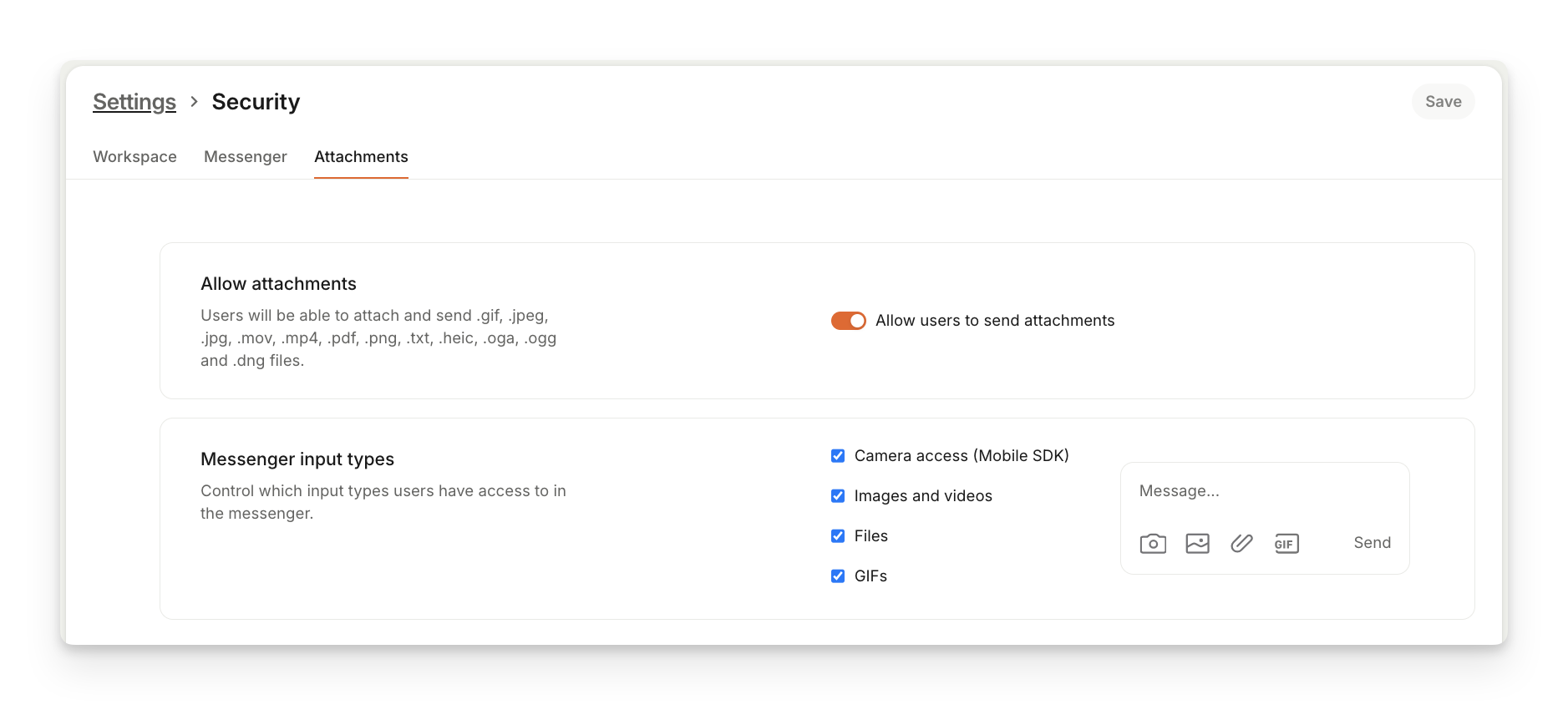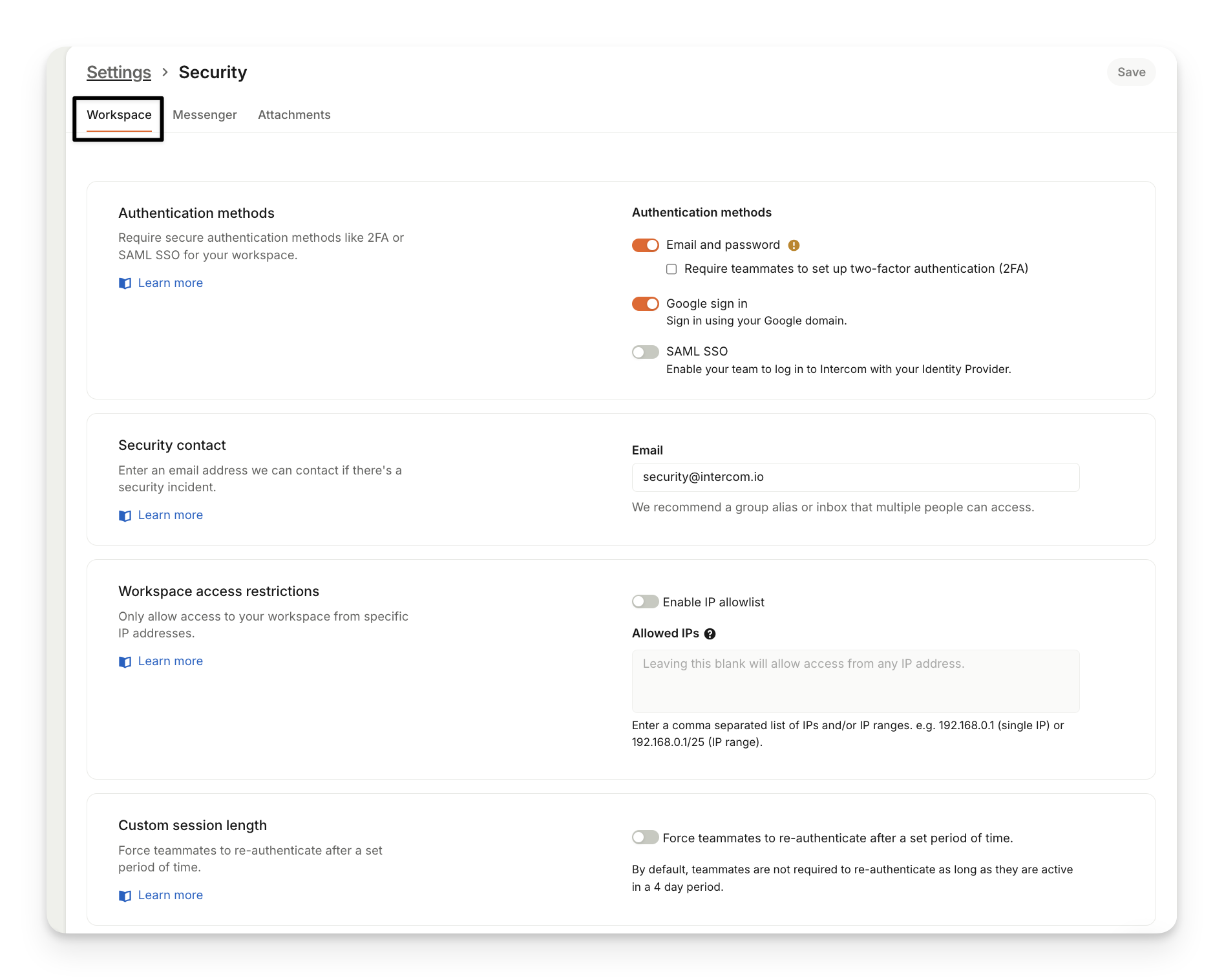 Some settings have multiple tabs across the top to help you configure different elements. For example, Security data includes configurations for Workspace, Messenger and Attachments.