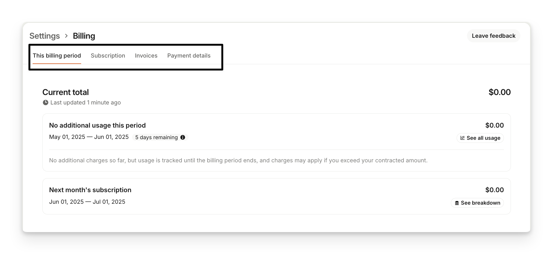 Check your subscription details, billing period charges, view your invoices and update your payment details and billing contacts in the Settings > Subscription > Billing.