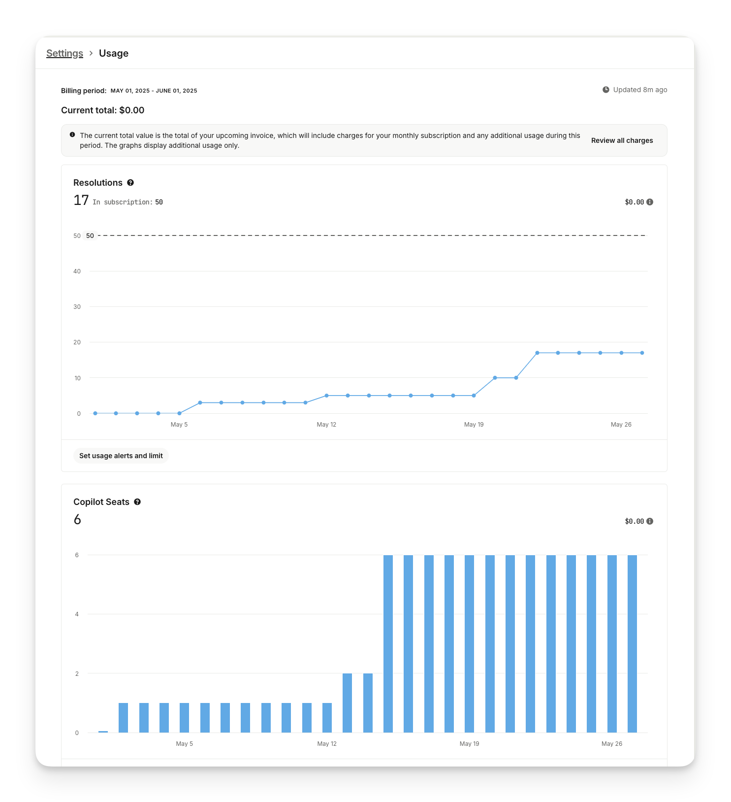 You can always view your billed usage for Sweo Resolutions and Copilot seats as well as set usage alerts and limits in the Settings > Subscription > Usage.
