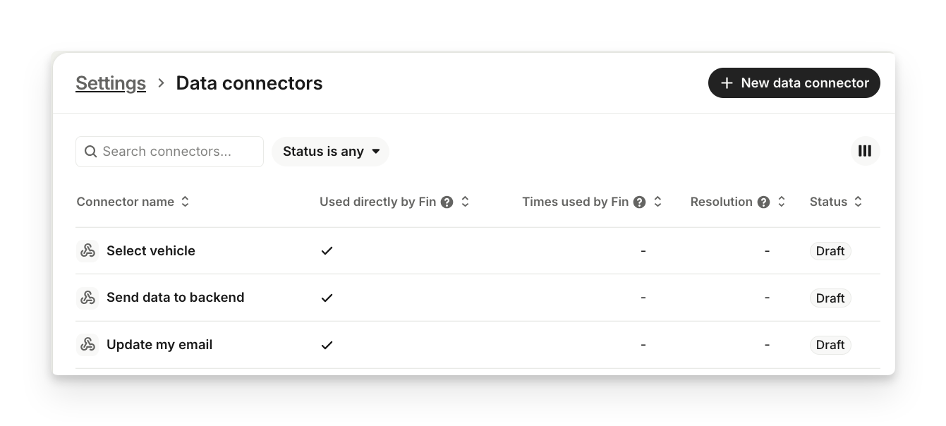 Data connectors automatically give personalized answers to customers, by connecting to data in external systems. Create data connectors in the Settings > Data connectors to connect your live external data to Intercom.