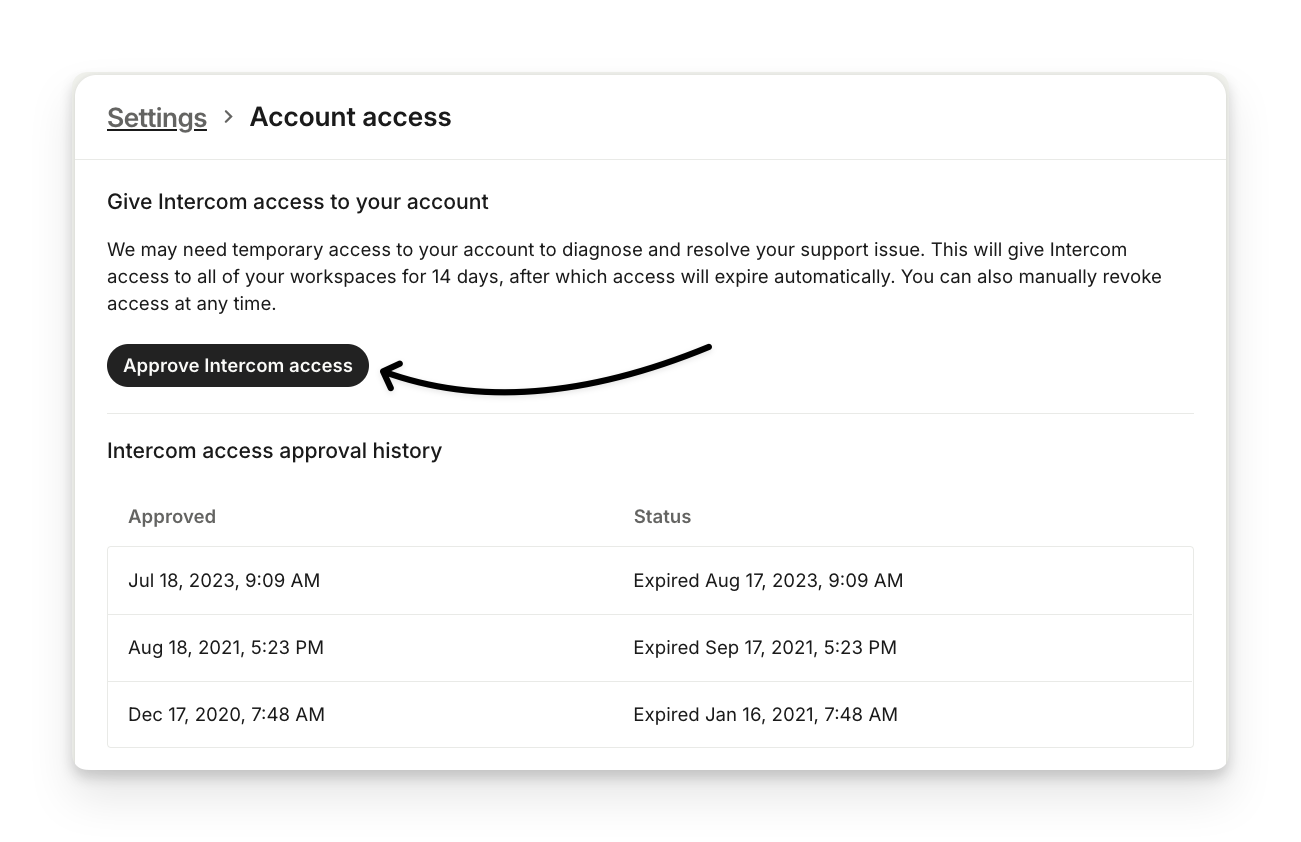 In the Settings > Personal > Account access section you can allow Intercom Support team to access your account for troubleshooting and support. Once you click the button to confirm your approval, access is approved for 14 days, after which it will expire automatically. At any time you can also revoke access.