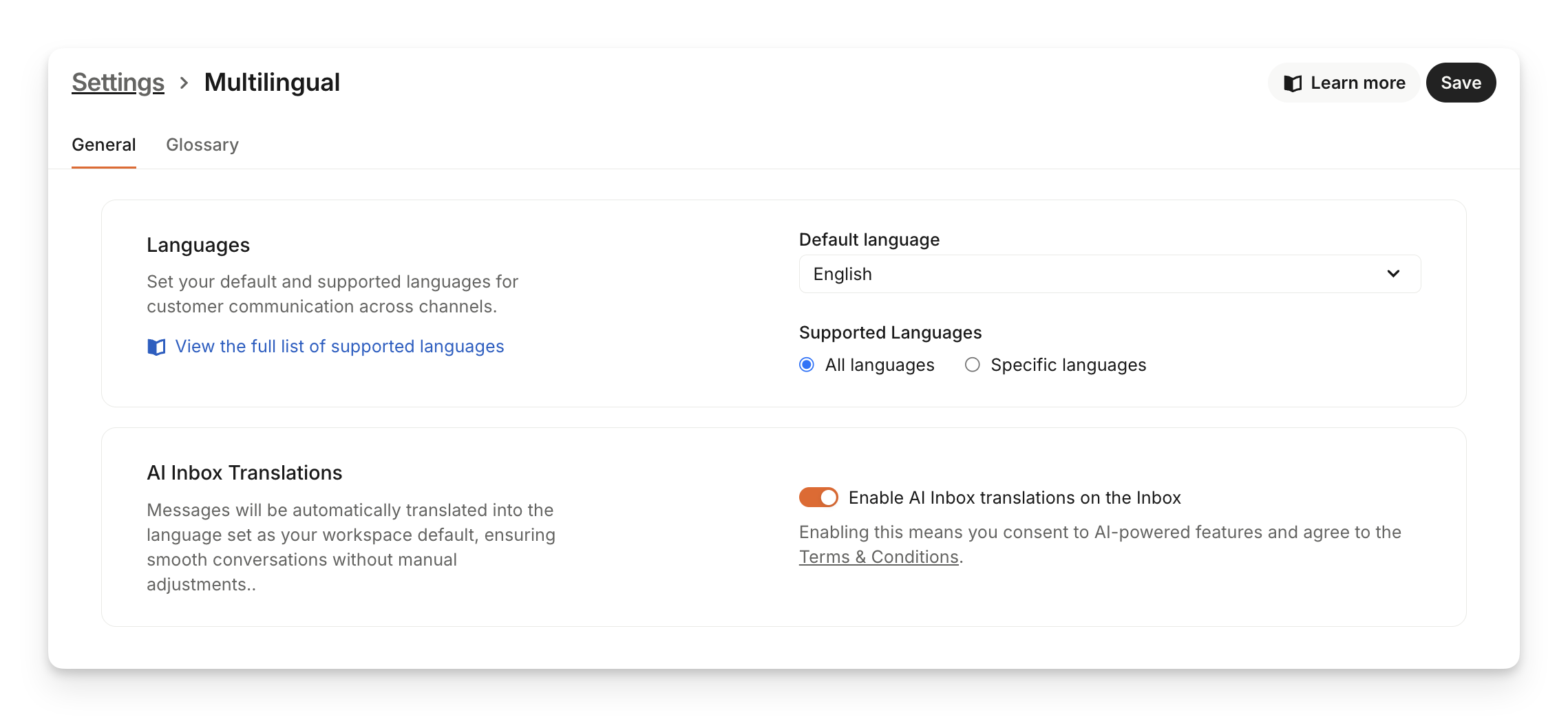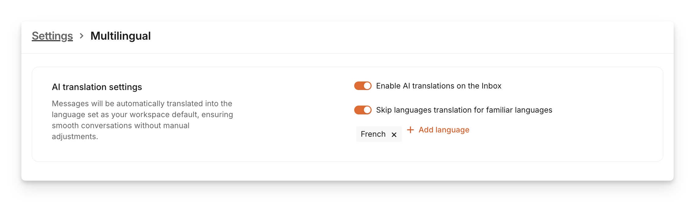 Set up and manage your multilingual settings including supported languages from Settings > Workspace > Multilingual.