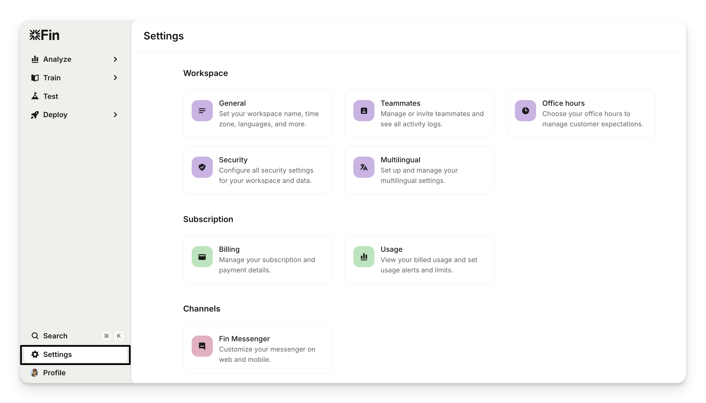 The Settings page is where you can find all your Intercom workspace settings in one accessible area. This offers you a clear view of Intercom's configurations, streamlining the setup process for your workspace, and enabling you to customize Intercom to suit your unique needs.