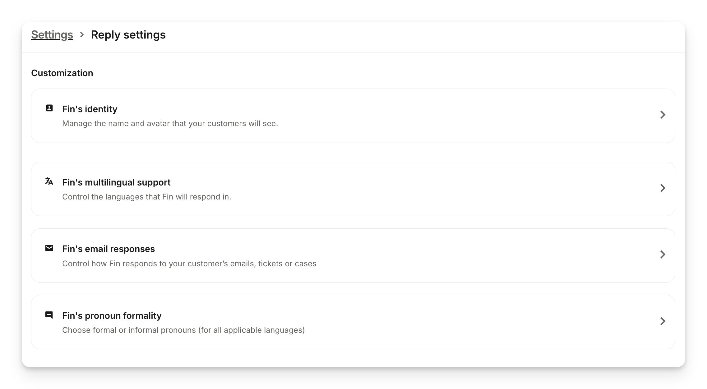 Customize Sweo's identity, control Sweo's multilingual support, control Sweo's email responses, and choose formal or informal pronouns for all applicable languages in Settings > Reply settings.