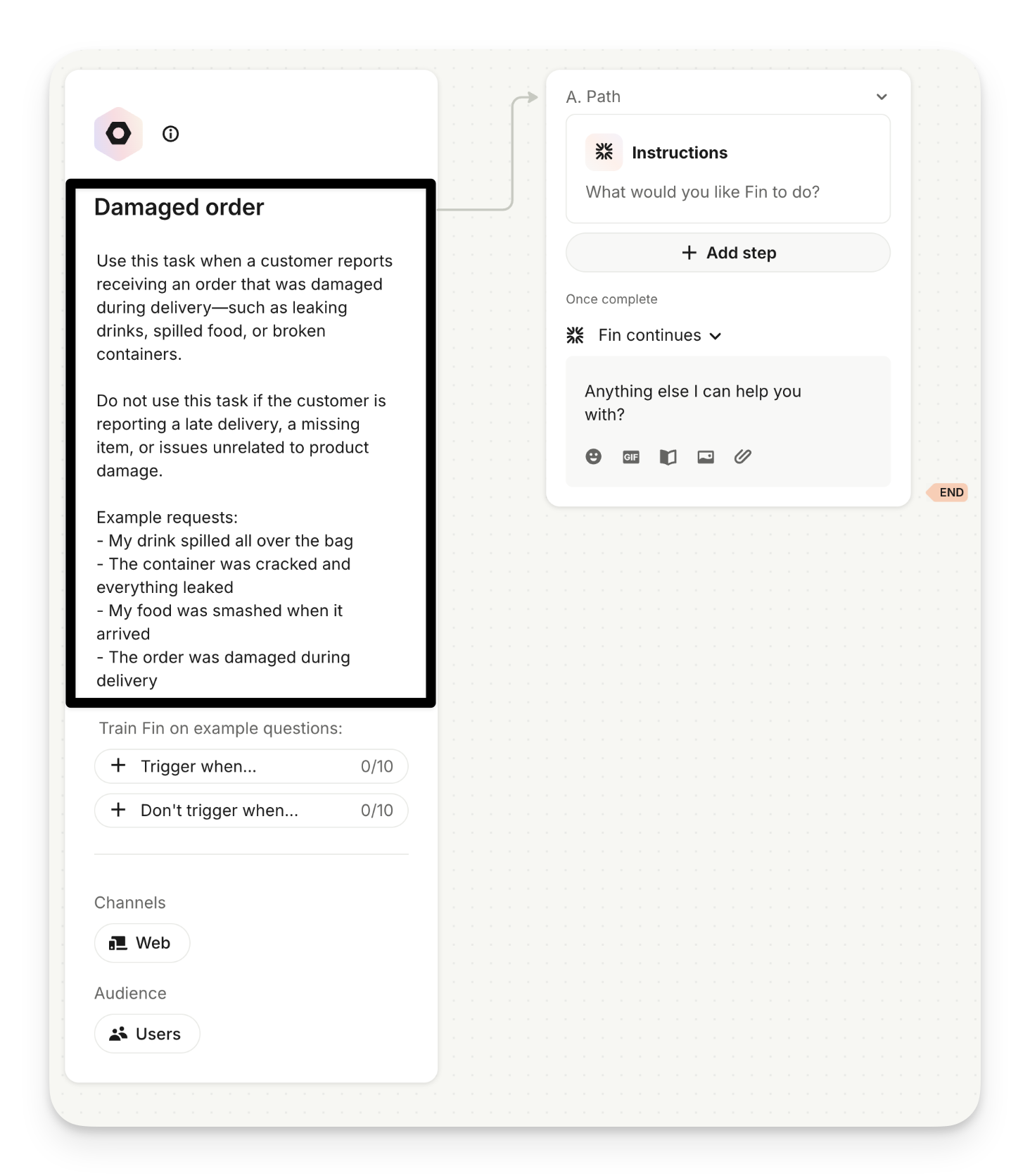 “Don't trigger when...” examples should only be included if you’re observing incorrect triggering behavior. Negative examples help refine detection by clarifying what Sweo should not respond to, but avoid adding them unless they’re addressing a specific problem with misfiring triggers.
