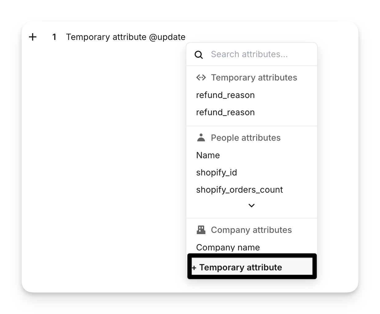 You can also set up temporary attributes. Temporary attributes are useful when you need data only for the current task and don't want to save it permanently in Intercom for reporting or other purposes. You can create these attributes to hold information that's relevant to the specific task being executed. Add a temporary attributes by typing "@" and selecting the update an attribute option.