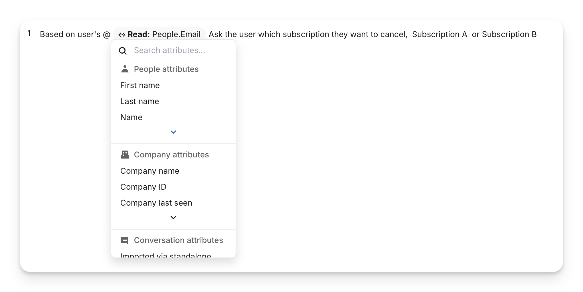 Add attributes to the instructions block by typing "@" in line with your text instructions. This allows Sweo to read and update attributes based on your specific business rules, at clear moments, with precise values. You can use any people, company, conversation, or temporary attribute.