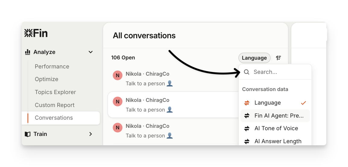 To view Sweo's conversations, go to Analyze > Conversations.