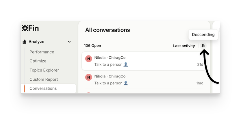 Last activity – Sorts items based on the date and time of the last activity. The timestamp will be based on the latest activity. Activities include user, teammate, and bot replies, actions like reopening, missed SLA events, and notes.
