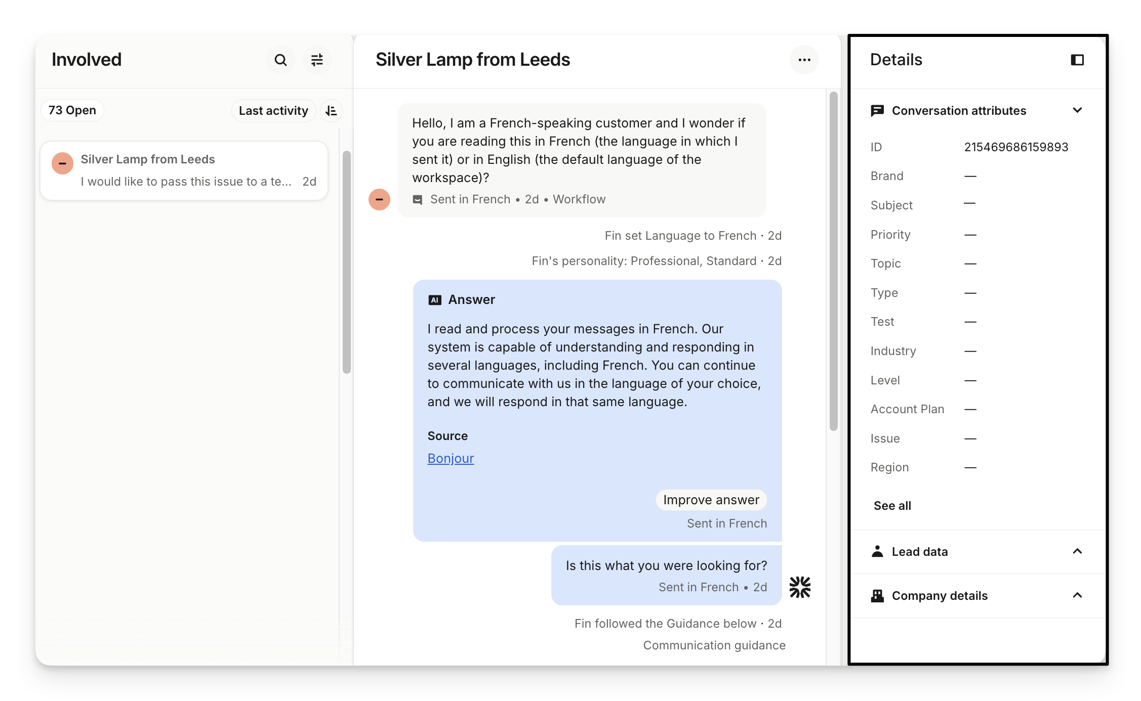 On the right side, you also have the conversation Details panel, this gives you more context on your conversation attributes.