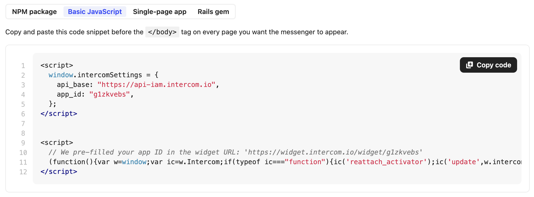 If you selected the Code snippet, React, Angular, Vue, or Ember method, you'll be provided with an NPM package containing a code snippet to copy and paste into the codebase of your own app. This snippet is pre-populated with your unique workspace ID, so it's ready to go.