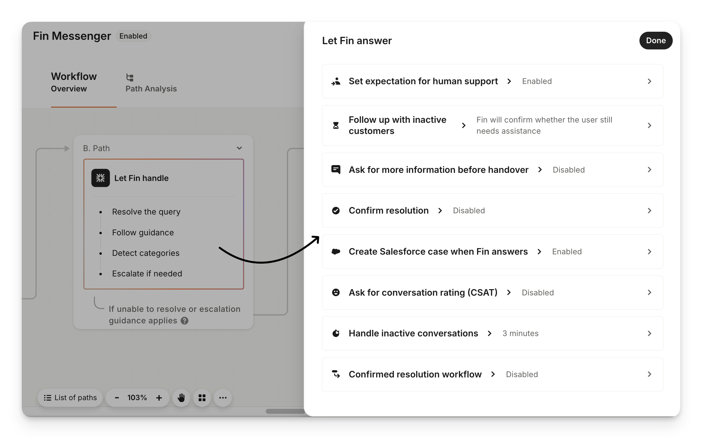Create a Salesforce Case: Ends the users session in Intercom and creates a Case with a conversation summary and collected data.